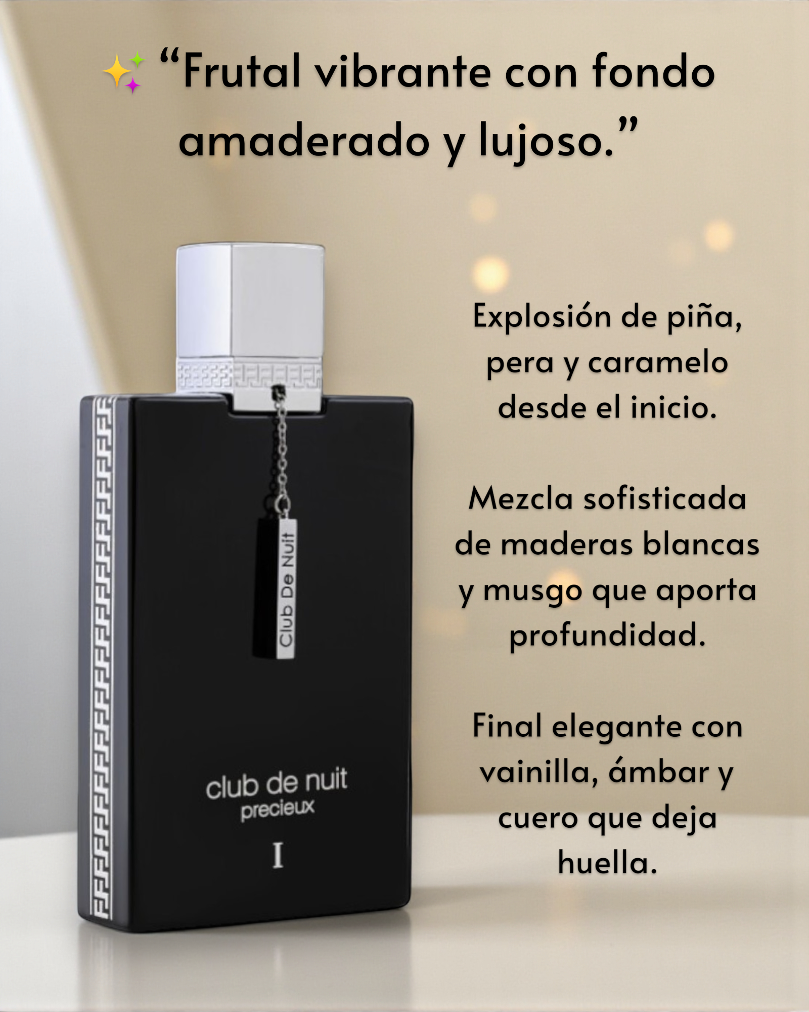 Club de Nuit Precieux de Armaf es una fragancia oriental amaderada que ofrece una experiencia olfativa sofisticada y envolvente. Se abre con notas vibrantes de piña, limón, caramelo, pera, bergamota, pimienta rosa y pimienta negra, proporcionando una introducción dulce y especiada. En el corazón, el musgo de roble, maderas blancas, anís, jazmín y lirio de los valles aportan una mezcla floral y amaderada que añade profundidad. La base combina ambroxan, ámbar, vainilla, almizcle blanco, cuero, cedro y pachulí, creando una estela cálida y duradera.