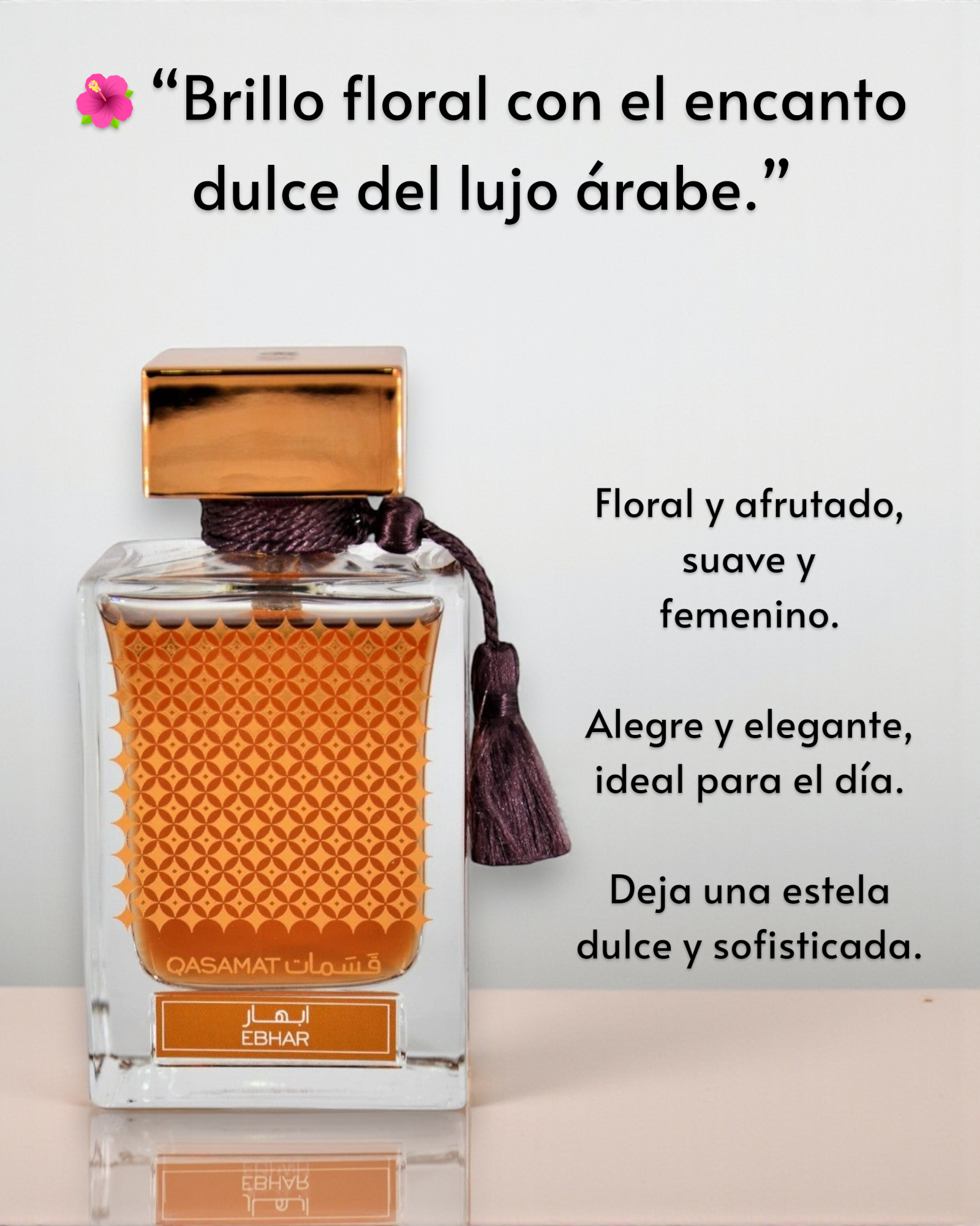 Qasamat Ebhar de Rasasi es una fragancia de la familia olfativa Floral Frutal Gourmand para mujeres y hombres, lanzada en 2020. Se abre con notas frescas y afrutadas de manzana verde y limón, proporcionando una introducción vibrante y energizante. En el corazón, la raíz de lirio, la rosa damascena, el jazmín y el loto aportan una mezcla floral y dulce que añade profundidad y feminidad. La base combina vainilla, praliné, haba tonka y almizcle, creando una estela cálida y dulce que equilibra la composición.