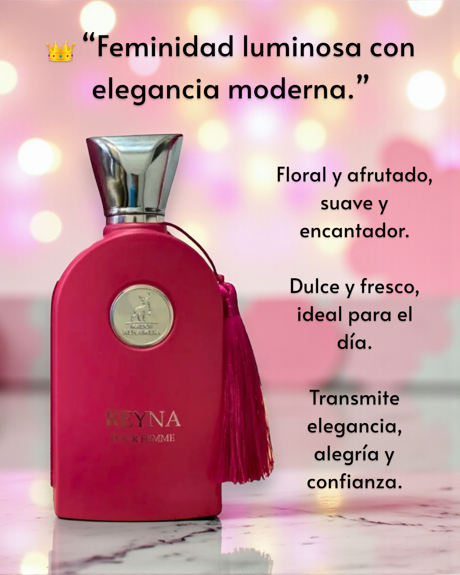 Reyna pour Femme de Maison Alhambra es una fragancia de la familia olfativa Floral Frutal, lanzada en 2023. Se abre con notas vibrantes de mandarina, bergamota y toronja, proporcionando una introducción fresca y cítrica. En el corazón, la frambuesa, la flor de azahar del naranjo y la grosella negra aportan una dulzura afrutada y floral. La base combina malvavisco, crema batida, almizcle y ambreta, creando una estela suave y gourmand.
