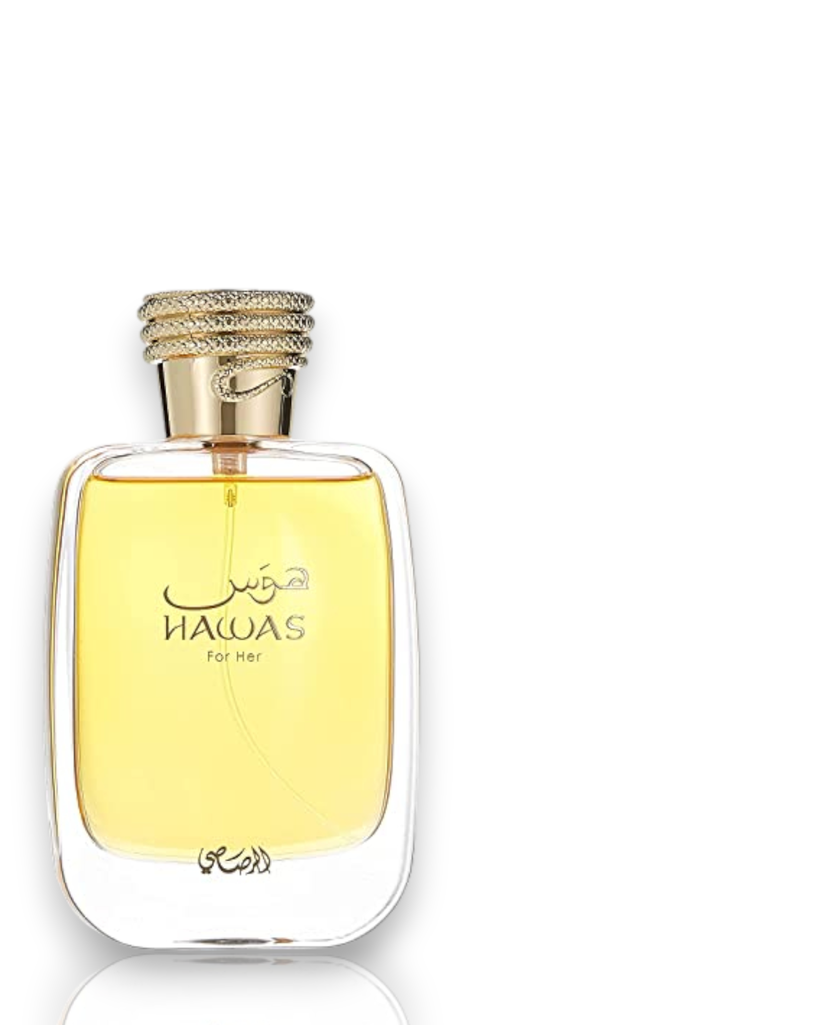 Hawas for Her de Rasasi es una fragancia de la familia olfativa Floral para mujeres, lanzada en 2015. Se abre con notas vibrantes de granada, manzana y toronja, proporcionando una introducción dulce y afrutada. En el corazón, el iris, el jazmín sambac y las notas cítricas aportan una mezcla floral y fresca que añade profundidad y feminidad. La base combina praliné, pachulí y vetiver, creando una estela dulce y terrosa que equilibra la composición.