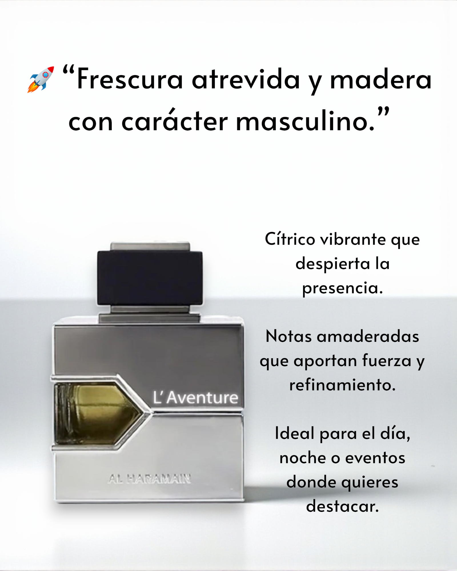 L'Aventure de Al Haramain es una fragancia de la familia Chipre Frutal que combina notas cítricas y amaderadas para una experiencia olfativa sofisticada y vibrante. Las notas de salida son limón, bergamota y elemí, que aportan una apertura fresca y energizante. En el corazón, las notas amaderadas, el jazmín y el lirio de los valles añaden profundidad y elegancia. La base de almizcle, pachulí y ámbar proporciona una fijación cálida y duradera.