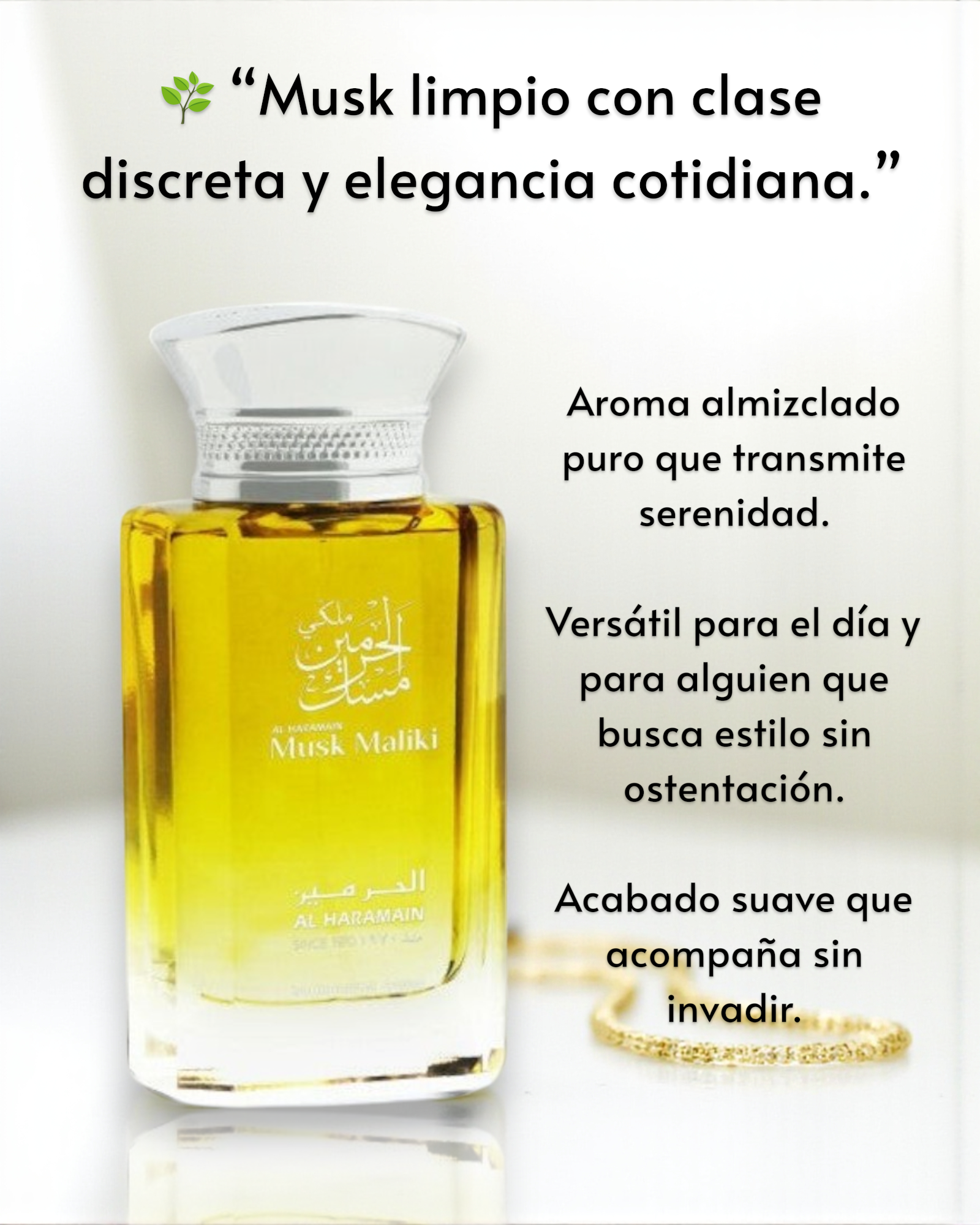 Musk Maliki de Al Haramain es una fragancia floral amaderada almizclada que ofrece una experiencia olfativa fresca y elegante. Se abre con notas de manzana verde, limón y hoja de violeta, proporcionando una introducción vibrante y refrescante. En el corazón, el jazmín marroquí, el jazmín italiano, la rosa búlgara y el geranio aportan una rica mezcla floral que es tanto delicada como encantadora. La base combina narciso, almizcle y sándalo, creando un final cálido y sofisticado que envuelve los sentidos.