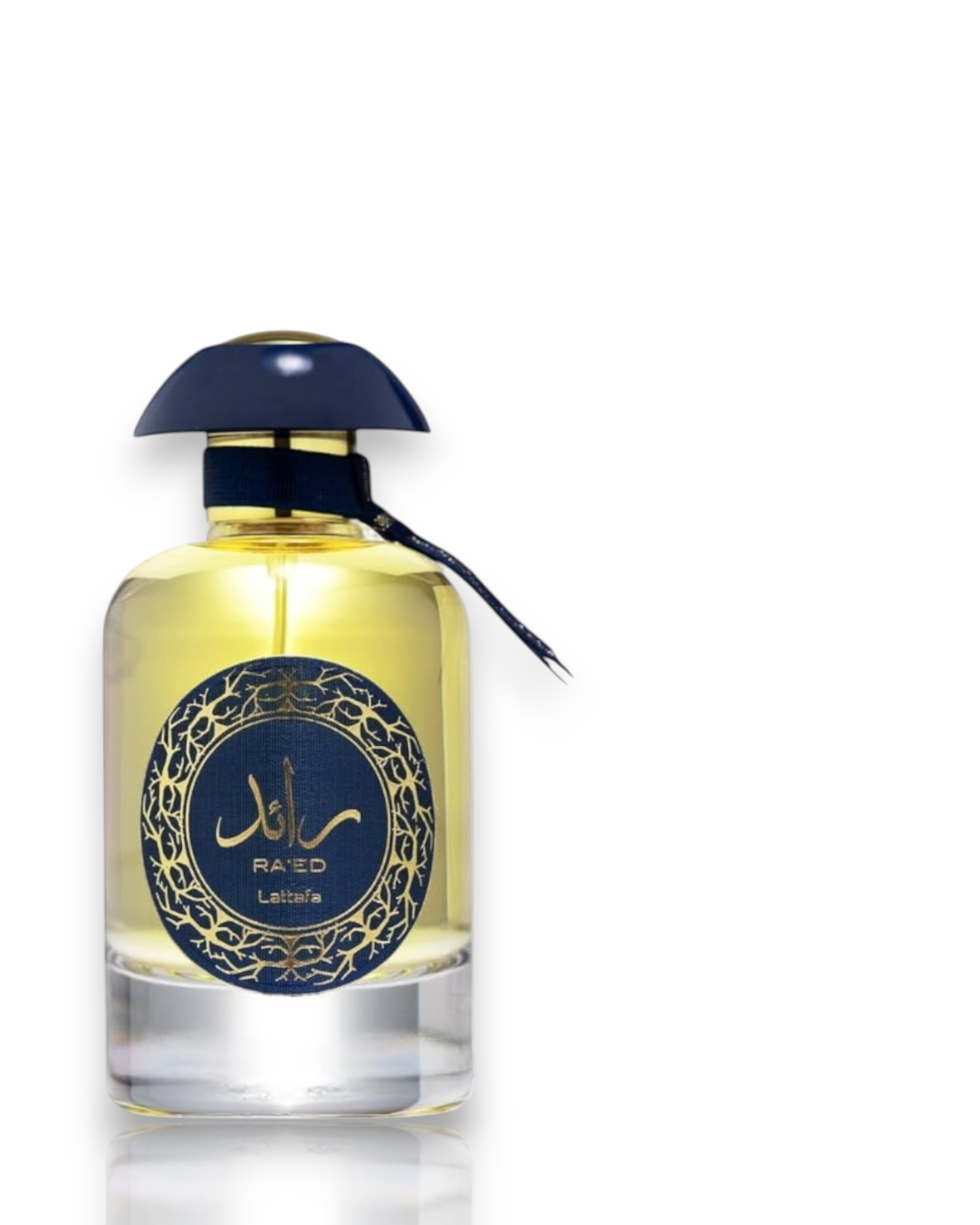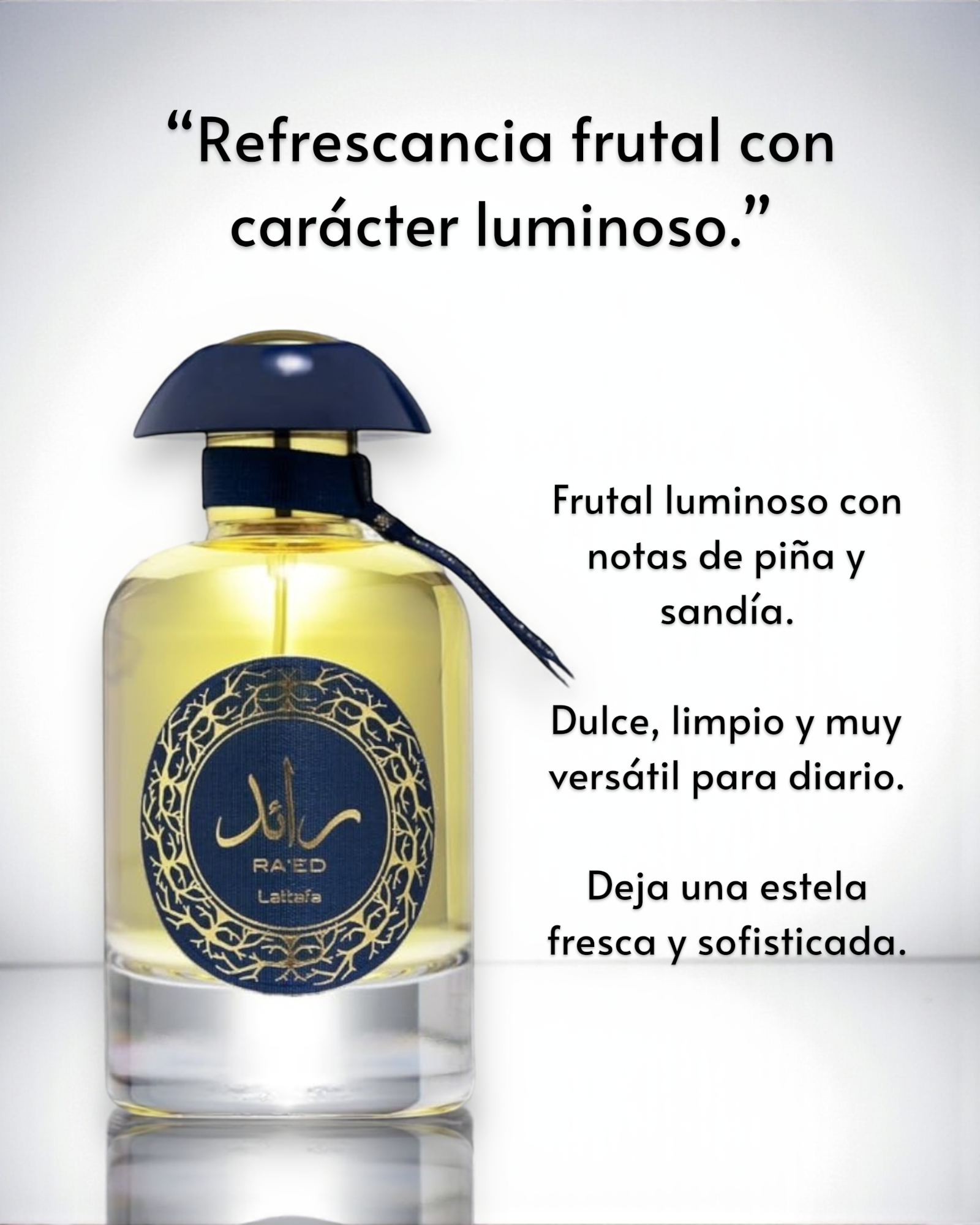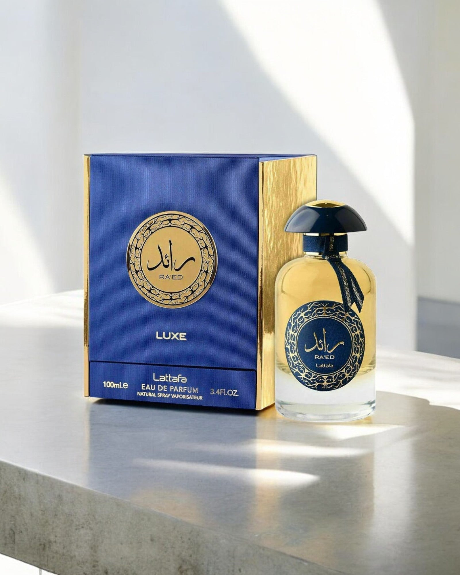 Ra'ed Luxe de Lattafa es una fragancia ámbar especiada que se abre con notas de enebro, piña, sandía, jazmín, pimienta rosa y flor de acacia, ofreciendo una introducción fresca y afrutada. En el corazón, la lavanda, la salvia, las notas herbales y la canela aportan una faceta aromática y especiada. La base combina ámbar, hielo, vainilla, vetiver, fresa, haba tonka, almizcle, castaña y sándalo, proporcionando una profundidad dulce y amaderada.