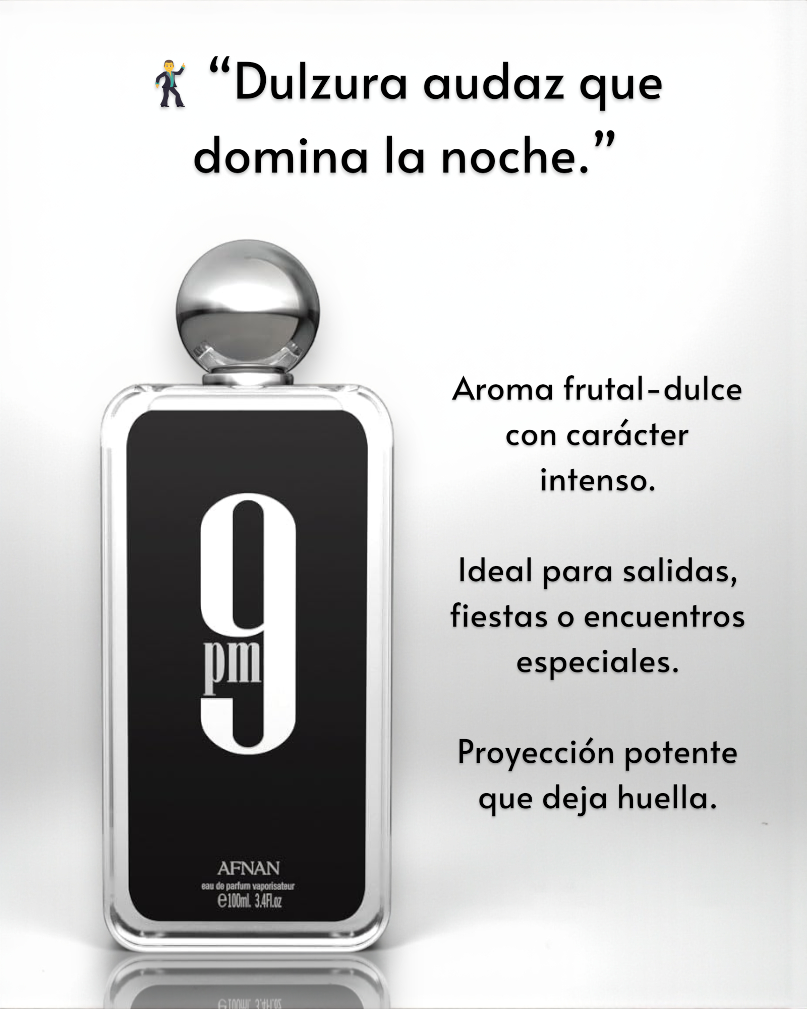9 PM de Afnan es una fragancia seductora y envolvente que combina notas dulces y especiadas para una experiencia olfativa intensa. Las notas de salida presentan bergamota, lavanda, canela y manzana, ofreciendo una apertura fresca y especiada. El corazón de azahar y lirio del valle aporta un toque floral, mientras que la base de vainilla, haba tonka, ámbar y pachulí proporciona una profundidad cálida y dulce.