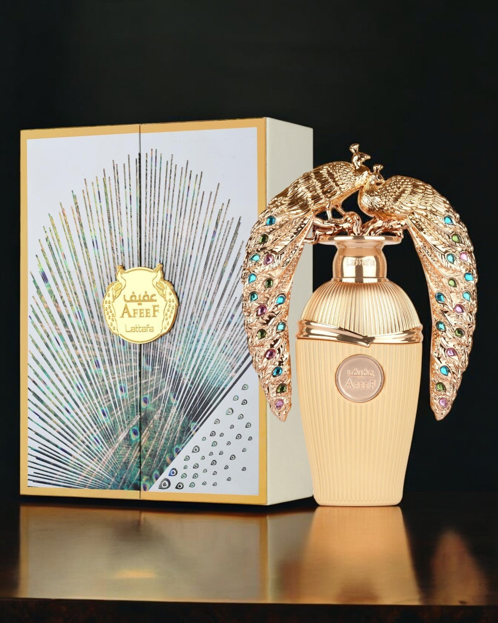 Afeef de Lattafa es una fragancia que se abre con notas de durazno, pimienta rosa y bergamota, ofreciendo una introducción afrutada y especiada. En el corazón, la tuberosa, la flor de azahar y el jazmín aportan una faceta floral y elegante. La base combina sándalo, praliné, ámbar y pachulí, proporcionando una profundidad dulce y amaderada.