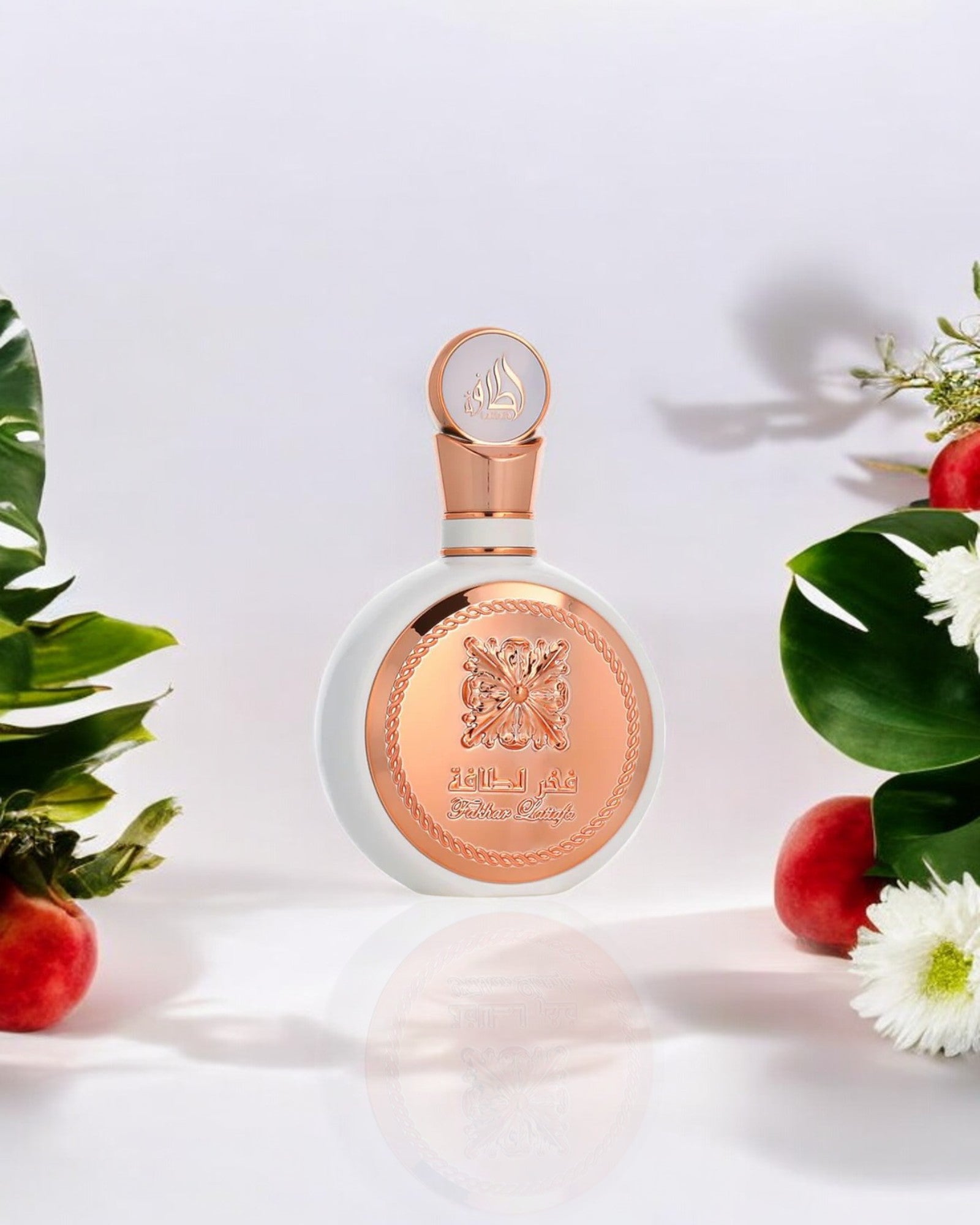 Fakhar Women de Lattafa es una fragancia floral afrutada que se abre con notas de frutas, lirio, granada y aldehídos, ofreciendo una introducción dulce y fresca. En el corazón, el nardo, el jazmín, la gardenia, el ylang-ylang, la madreselva, la rosa y la peonía aportan una rica mezcla floral. La base está compuesta por vainilla, almizcle blanco, sándalo y ambroxan, proporcionando una profundidad cálida y cremosa.