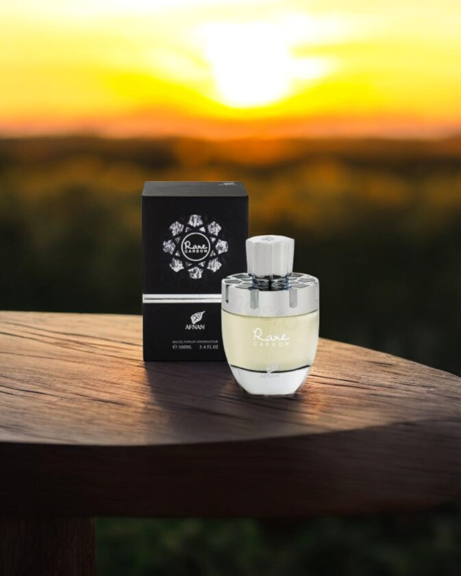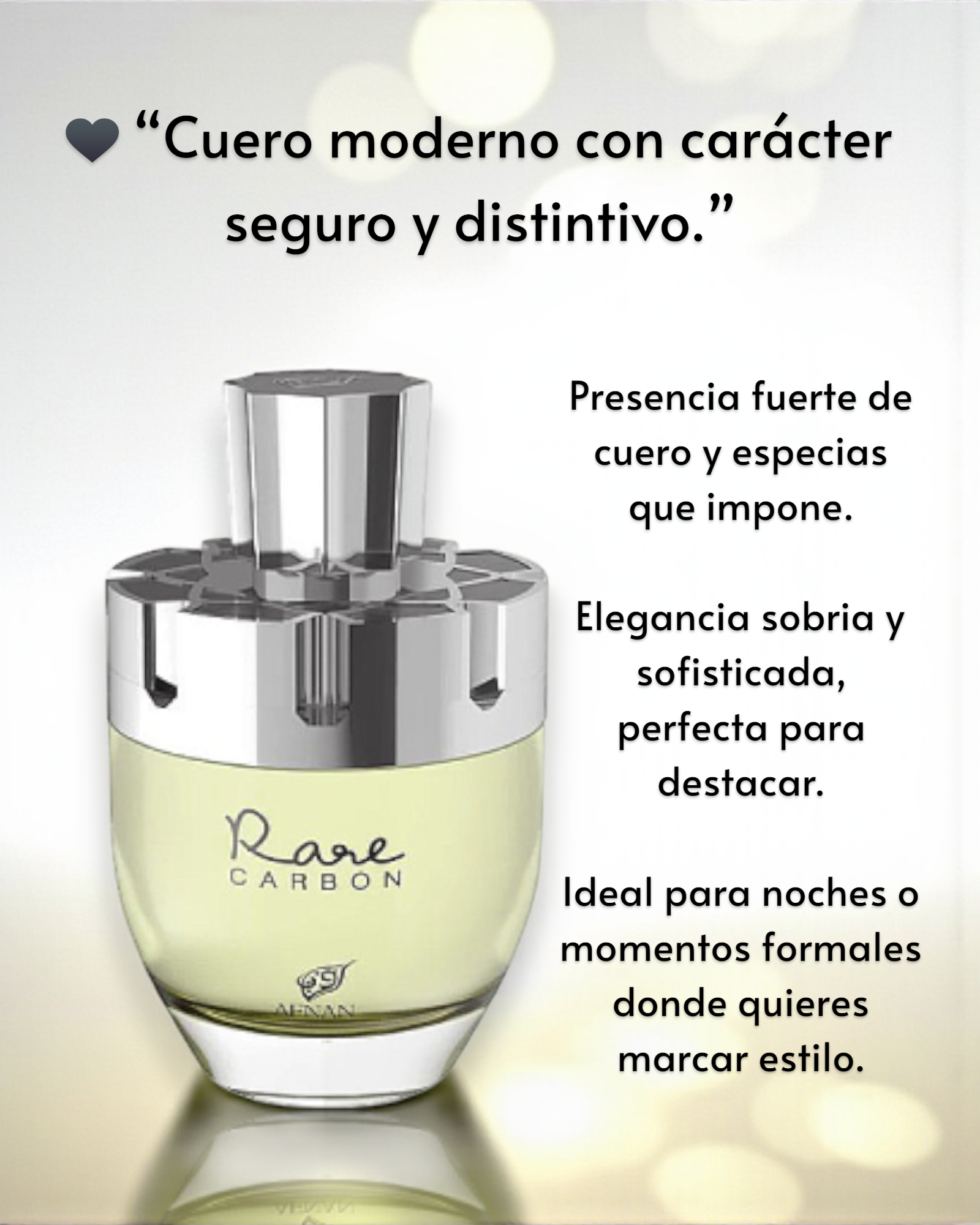 Rare Carbon de Afnan es una fragancia que exuda sofisticación y fuerza. Desde la primera aplicación, las notas de cuero, hoja de violeta, corteza de canela y nuez moscada crean una introducción audaz y cautivadora. A medida que evoluciona, un corazón de rosa, violeta, madera de cedro y madera de oud aporta profundidad y complejidad. Finalmente, la fragancia se asienta en una base de vetiver, sándalo y ámbar, dejando una impresión duradera de masculinidad y refinamiento.