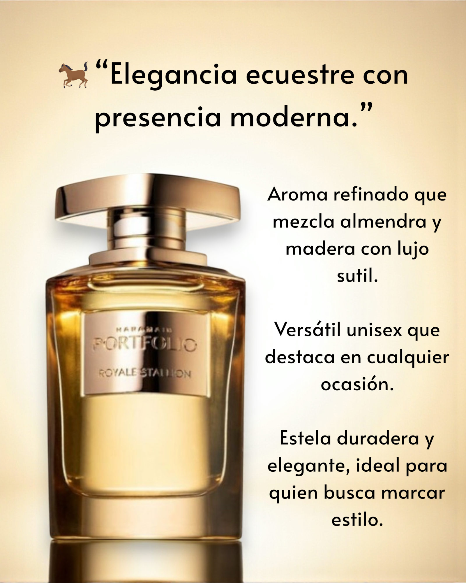 Portfolio Royale Stallion de Al Haramain es una fragancia de carácter refinado y elegante que combina un principio vibrante y especiado con un corazón floral‑dulce y un fondo cálido y envolvente. Al aplicarla, se siente primero una chispa fresca y especiada gracias a la bergamota, el heliotropo y un toque de comino. Luego emerge una capa cálida y cremosa de almendra amarga, lavanda y jazmín, equilibrando frescura con profundidad. Finalmente, la base de vainilla, sándalo y ámbar envuelve la fragancia con un rastro sensual, sofisticado y duradero. Es ideal para quienes quieren un aroma con presencia, clase y versatilidad.