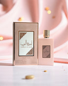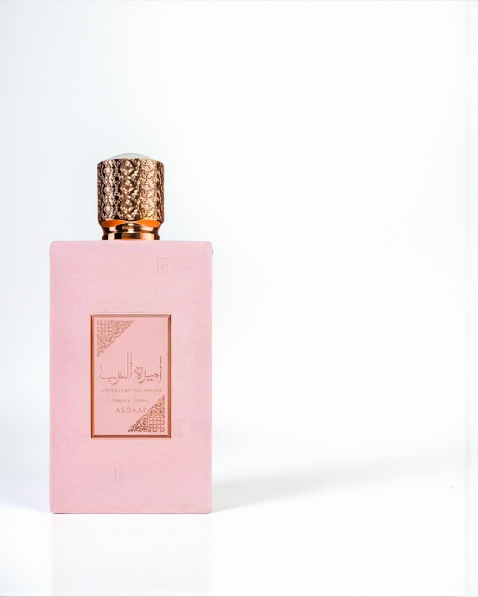 Descripción: Ameerat Al Arab Prive Rose Asdaaf es una fragancia seductora y femenina que inicia con notas de fresa jugosa y uva, se despliega hacia un corazón de rosa, jazmín y gardenia y termina con un fondo cálido de tonka, ámbar y sándalo, ofreciendo una experiencia dulce, floral y sofisticada.
