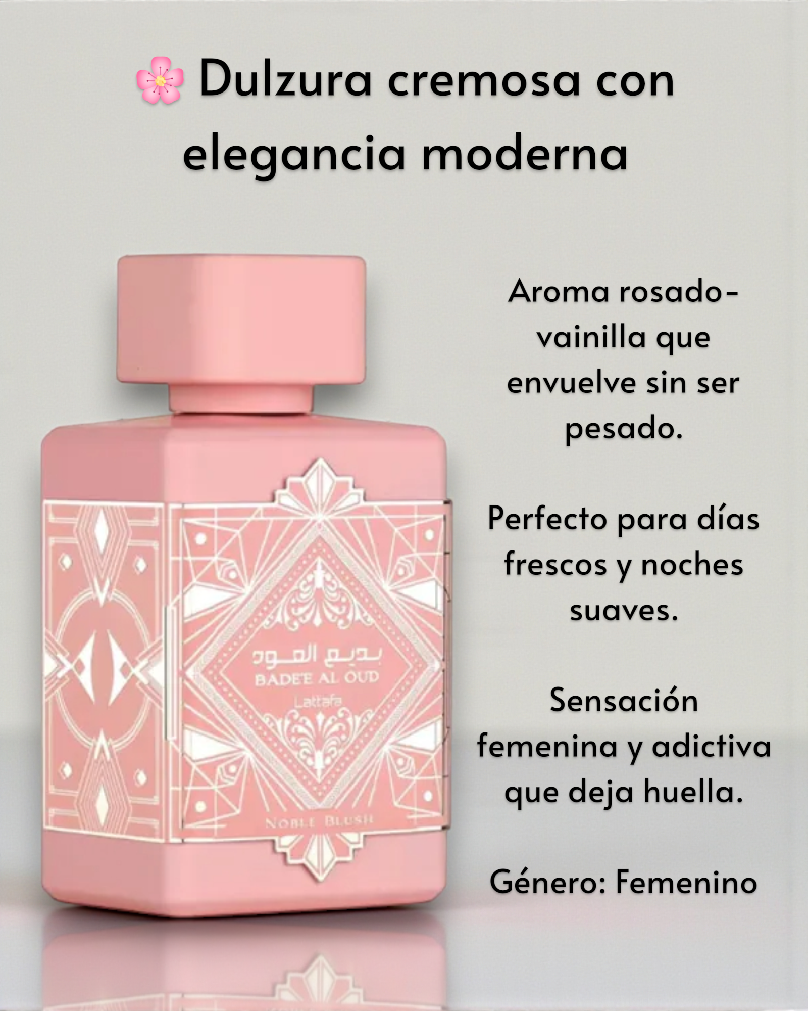 Noble Blush de Lattafa es una fragancia dulce, femenina y elegante que envuelve con suavidad y sofisticación. Desde la primera pulverización destaca su nota de “leche de rosa” — cremosa, delicada y romántica — que aporta un aire dulce y reconfortante. En su corazón, una mezcla de merengue y almendra añade una riqueza cremosa, calidez y un toque gourmand sutil. Finalmente, su base de vainilla, sándalo y almizcle deja una estela cálida, aterciopelada y sensual, perfecta para noches o momentos especiales. El conjunto transmite feminidad, dulzura y encanto, ideal para quien busca un aroma envolvente, delicado pero con personalidad.