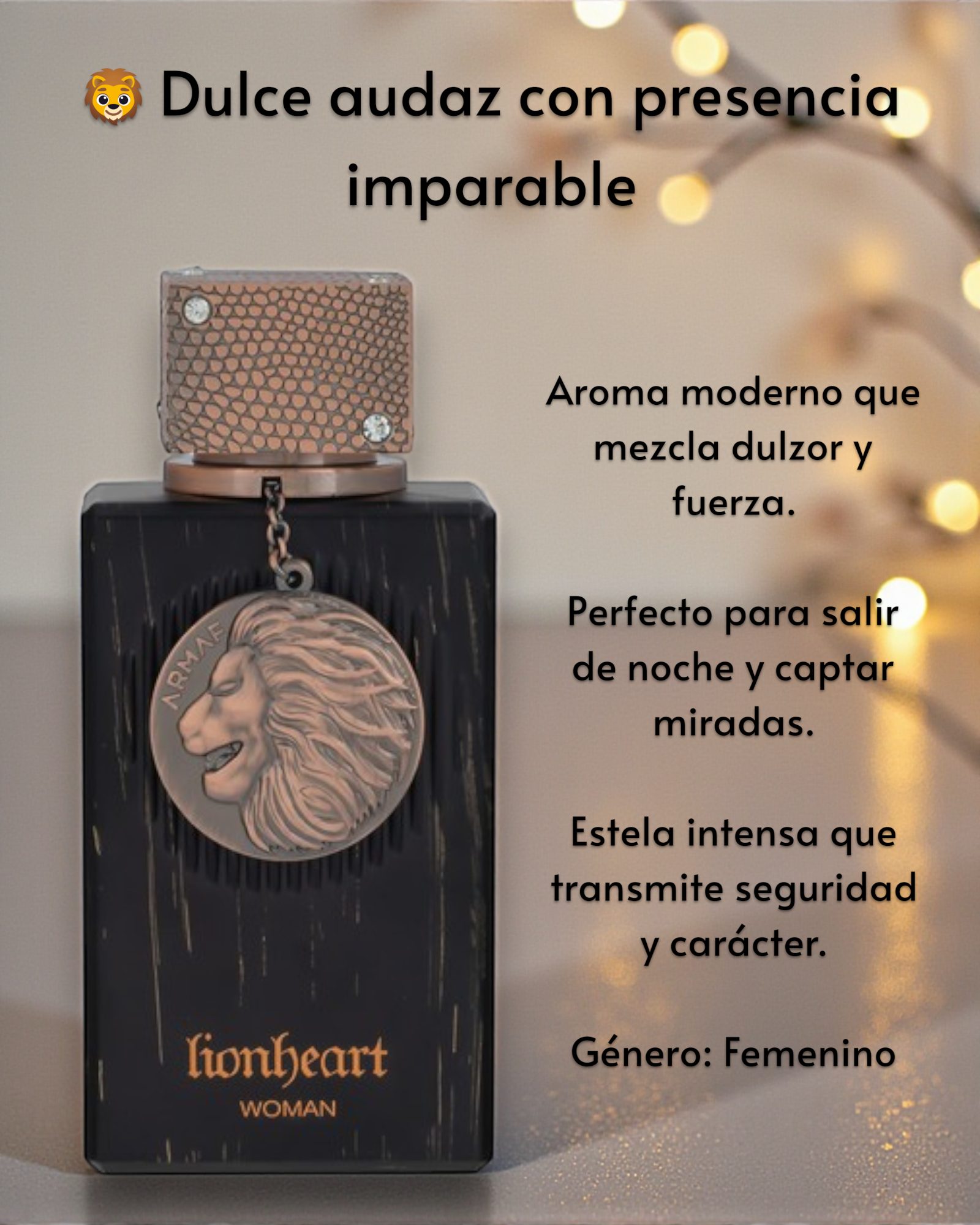 Club De Nuit Lionheart Woman de Armaf es una fragancia cálida, dulce y envolvente pensada para mujeres que quieren destacar con sensualidad y elegancia. Desde la primera pulverización, la combinación de lavanda y vainilla crea una apertura cremosa y reconfortante. En su corazón se hace presente el cacao junto al jengibre, aportando un carácter gourmand y especiado que recuerda a un postre exquisito. Finalmente, la base — dominada por absoluto de vainilla — deja una estela dulce, suave y persistente, perfecta para acompañar noches inolvidables.