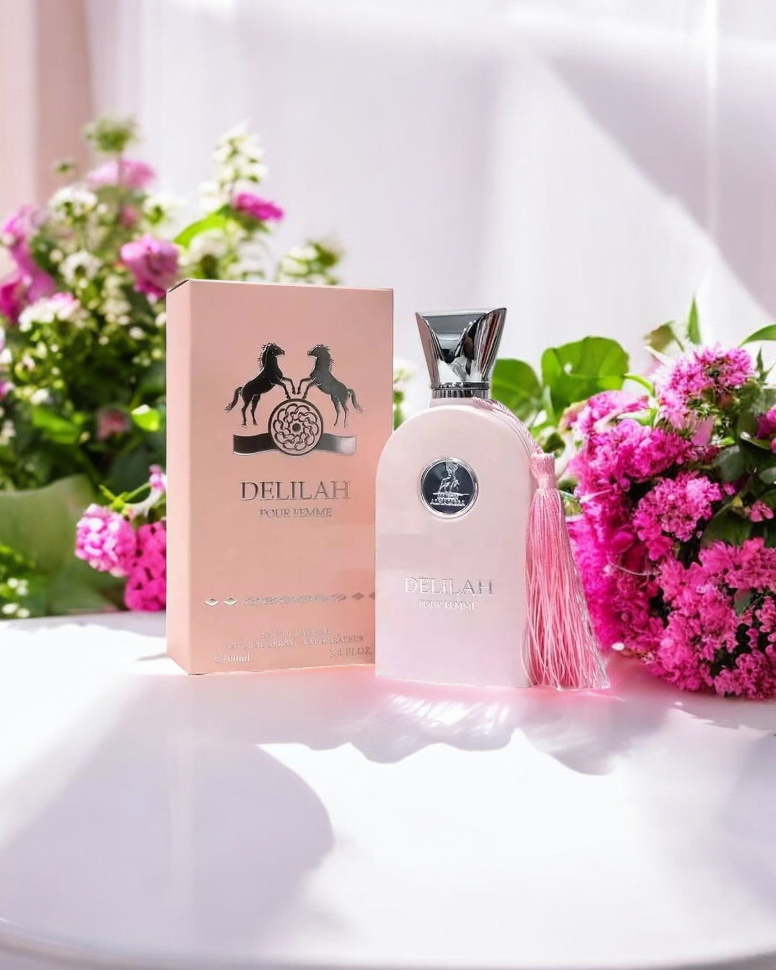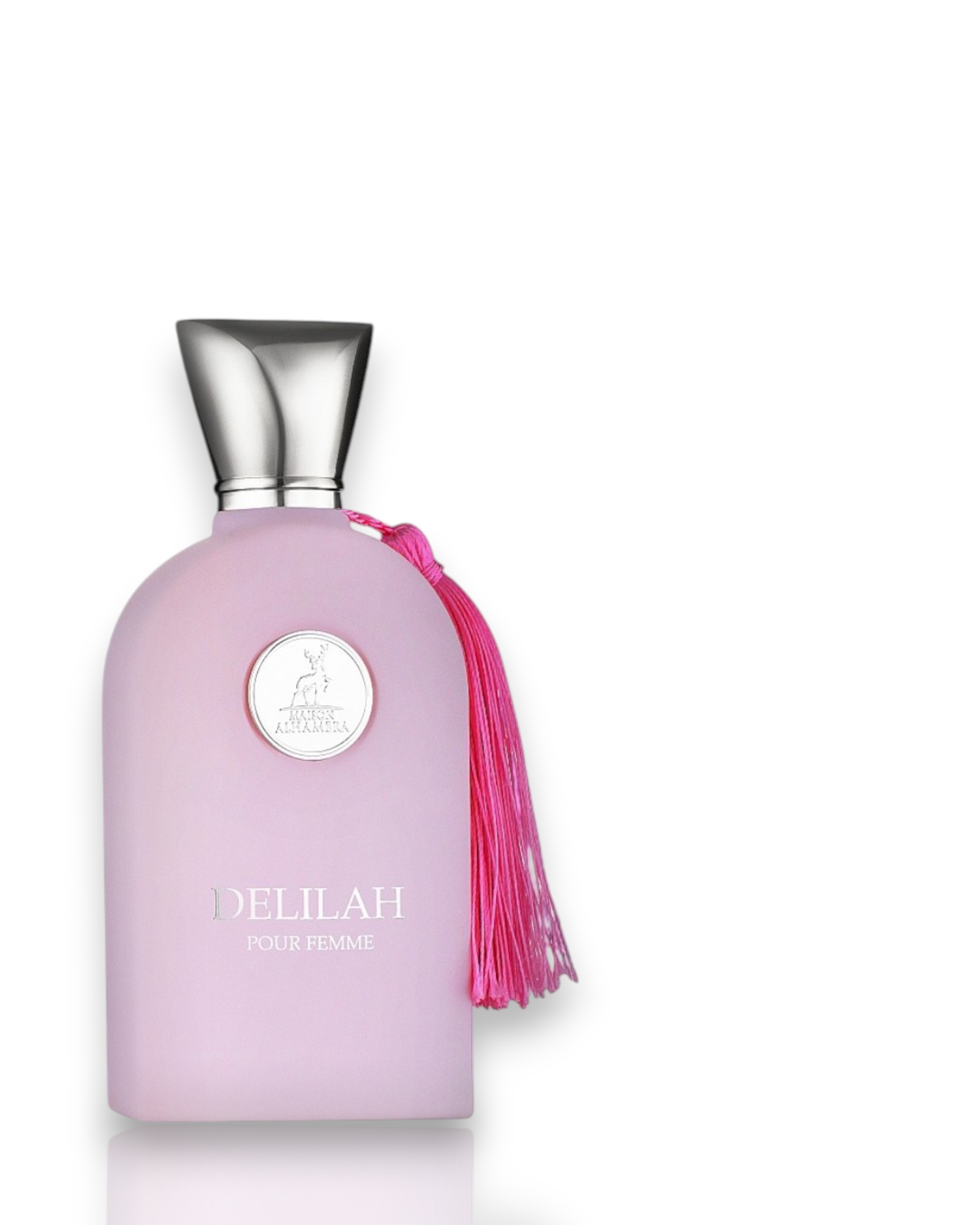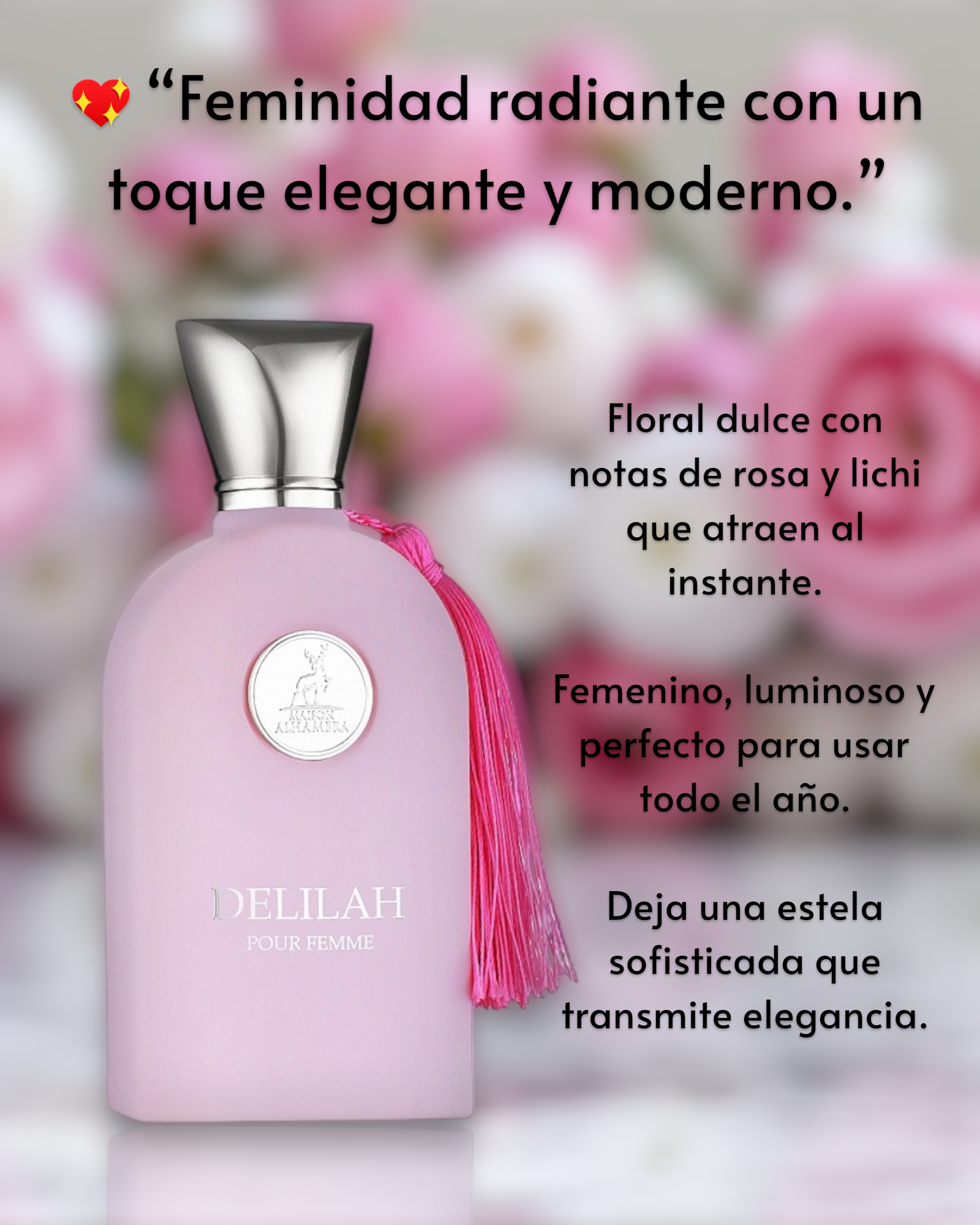Delilah de Maison Alhambra es una fragancia de la familia olfativa Floral Frutal para mujeres, lanzada en 2023. Se abre con notas de ruibarbo, lichi y bergamota, ofreciendo una introducción dulce y afrutada. En el corazón, la peonía, el lirio silvestre y la rosa aportan una mezcla floral elegante y femenina. La base combina vainilla, almizcle blanco y cachemira, creando una estela cálida y envolvente.