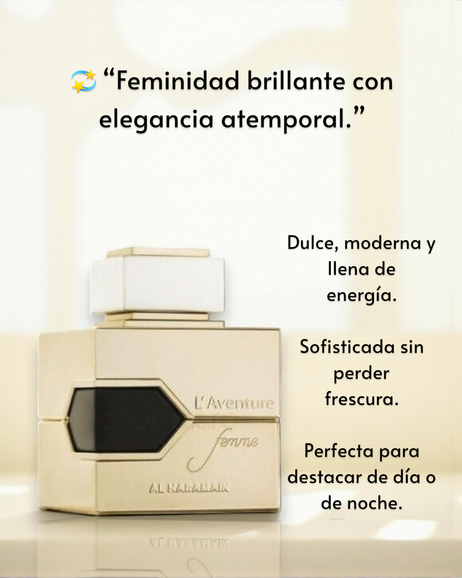 L'Aventure Femme de Al Haramain es una fragancia de la familia Floral Frutal que combina notas dulces y florales para una experiencia olfativa encantadora y femenina. Las notas de salida son piña, grosella negra, bergamota y bayas silvestres, que ofrecen una apertura jugosa y vibrante. En el corazón, el cedro, la fresia y la rosa aportan una mezcla floral y amaderada. La base de almizcle, sándalo, ámbar y vainilla proporciona una profundidad cálida y duradera.