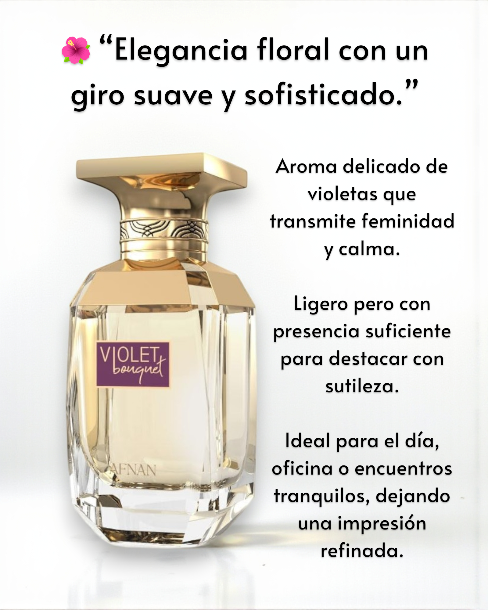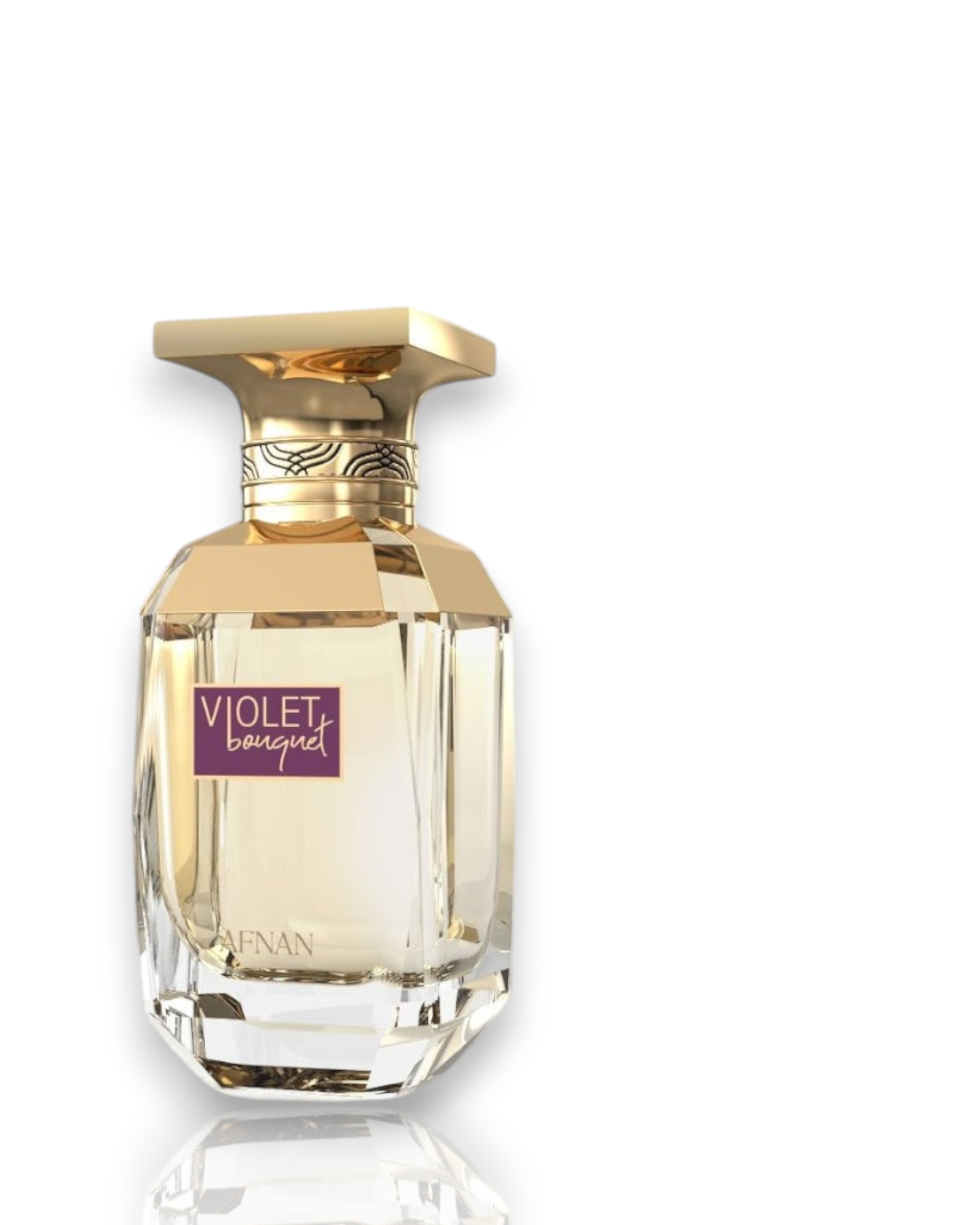 Violet Bouquet de Afnan es una fragancia floral que combina notas dulces y amaderadas para una experiencia olfativa encantadora y femenina. Las notas de salida de azafrán, notas dulces, notas amaderadas y cítricos ofrecen una apertura vibrante y dulce. En el corazón, el ámbar, la naranja, la ralladura de limón y las notas herbales aportan una riqueza aromática. La base de ámbar gris, especias, notas amaderadas y musgo de roble proporciona una profundidad cálida y terrosa.