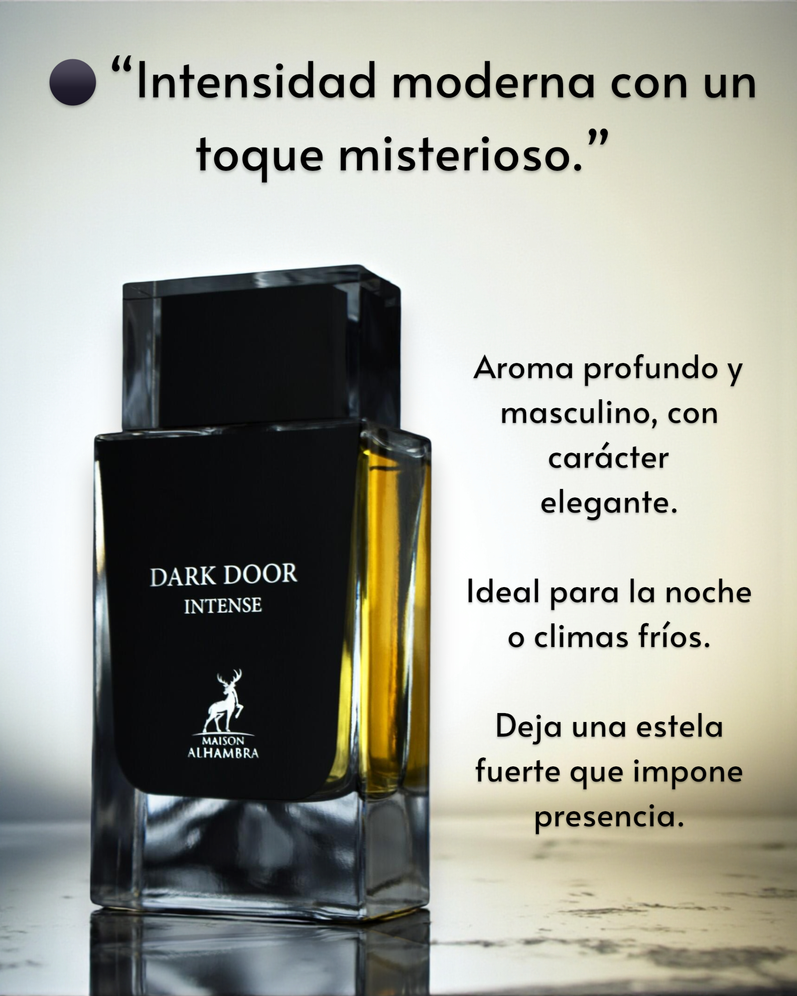 Dark Door Intense de Maison Alhambra es una fragancia de la familia olfativa Aromática para hombres y mujeres, lanzada en 2022. Se abre con una nota prominente de lavanda, ofreciendo una introducción fresca y aromática. En el corazón, el iris, la ambreta y la pera aportan una mezcla floral y afrutada que añade profundidad y suavidad. La base combina cedro de Virginia y vetiver, creando una estela amaderada y terrosa que equilibra la composición.