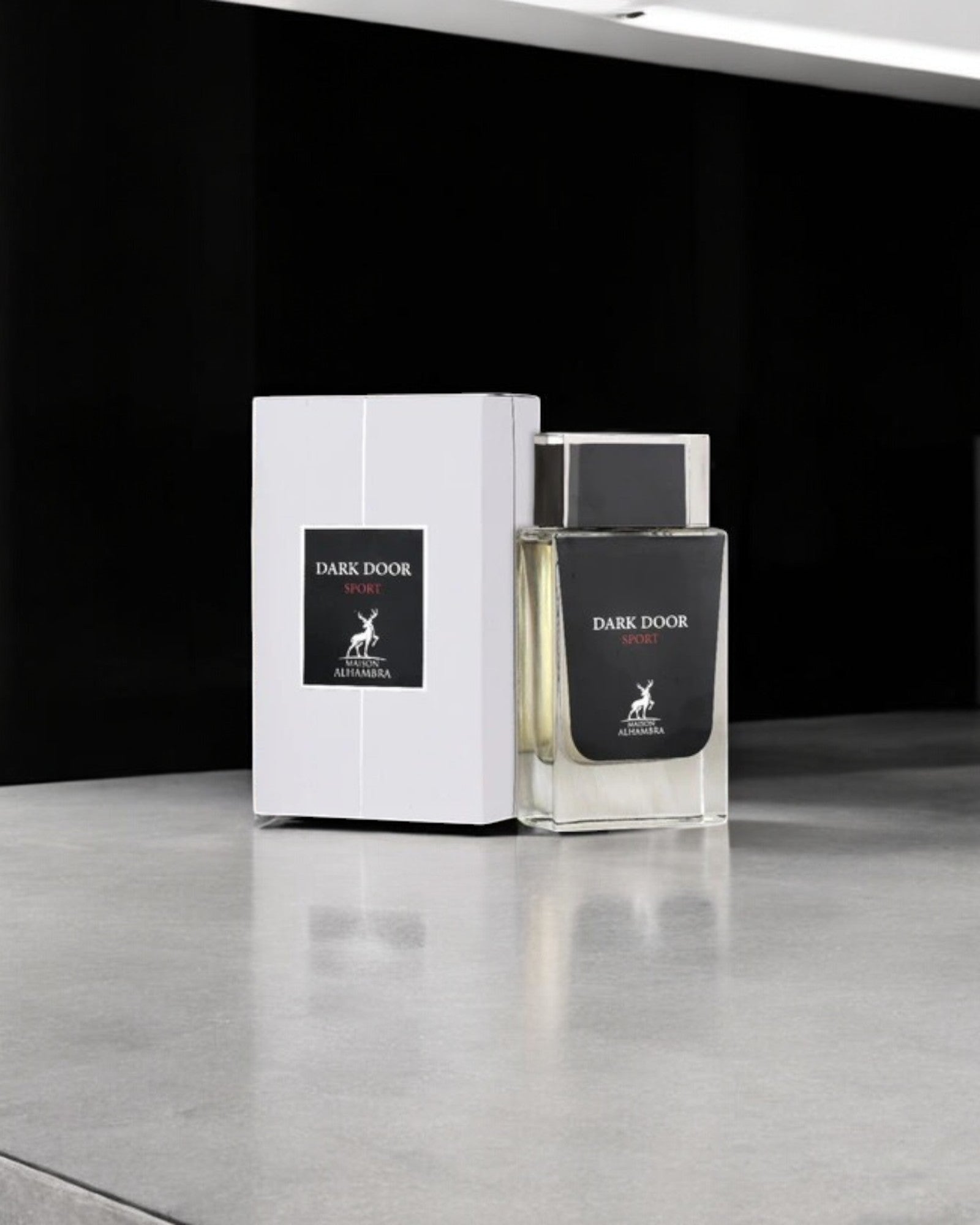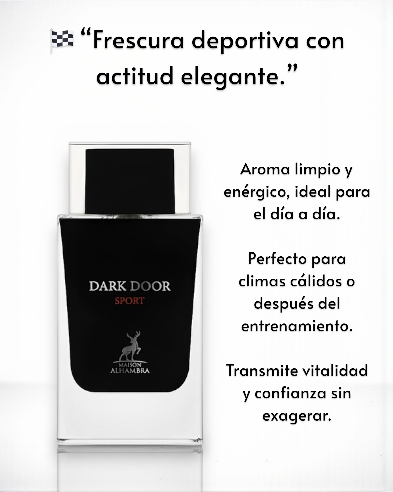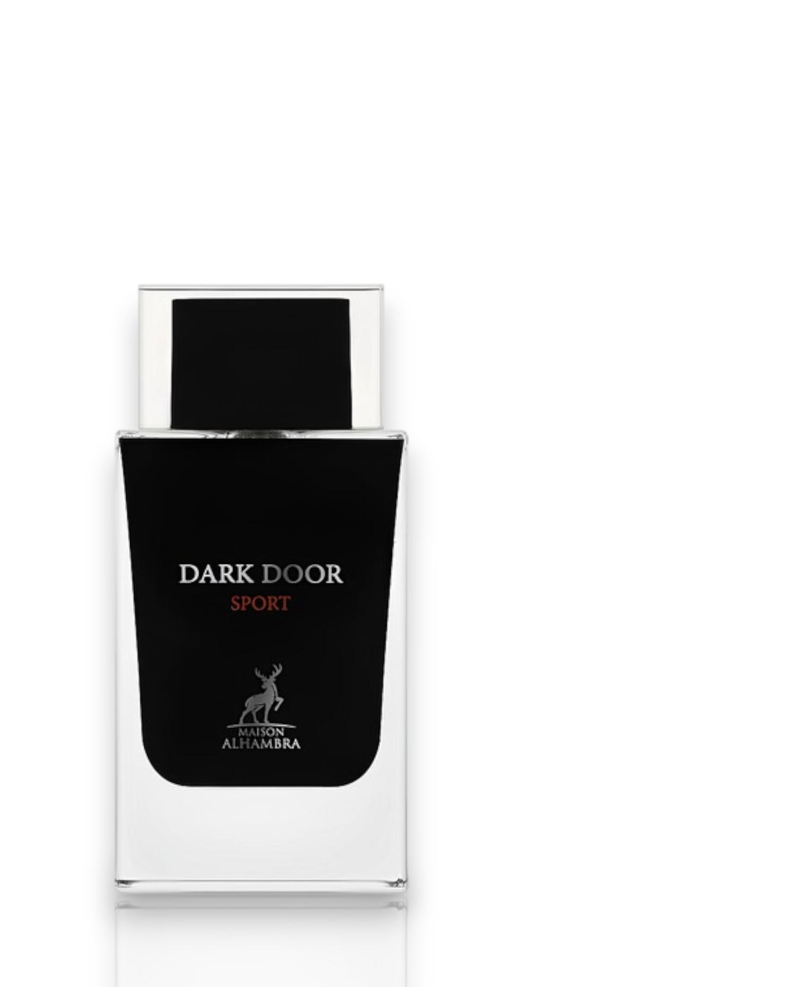 Dark Door Sport de Maison Alhambra es una fragancia de la familia olfativa Amaderada Aromática para hombres, lanzada en 2022. Se abre con notas cítricas vibrantes de toronja, limón, bergamota y resina de elemí, proporcionando una introducción fresca y energizante. En el corazón, el jengibre, el vetiver y el cedro aportan una mezcla especiada y amaderada que añade profundidad y calidez. La base combina lavanda, romero y sándalo, creando una estela aromática y reconfortante.