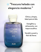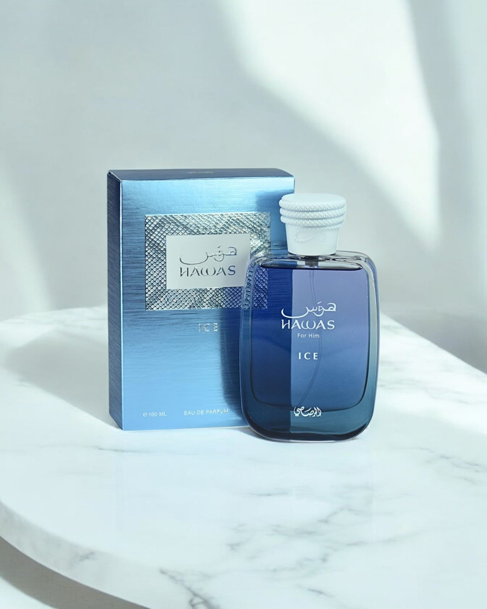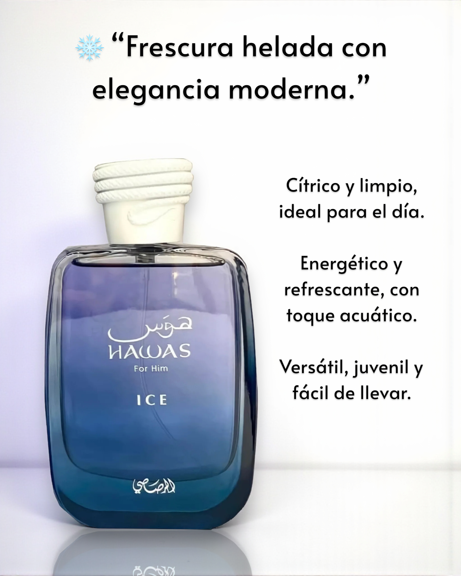 Hawas Ice de Rasasi es una fragancia de la familia olfativa Aromática para hombres, lanzada en 2023. Se abre con notas frescas y afrutadas de manzana, limón italiano, bergamota siciliana y anís estrellado, proporcionando una introducción vibrante y energizante. En el corazón, la ciruela, la flor de azahar del naranjo y el cardamomo aportan una mezcla dulce y especiada que añade profundidad y carácter. La base combina almizcle, ámbar, musgo y maderas flotantes, creando una estela cálida y amaderada que completa la composición.