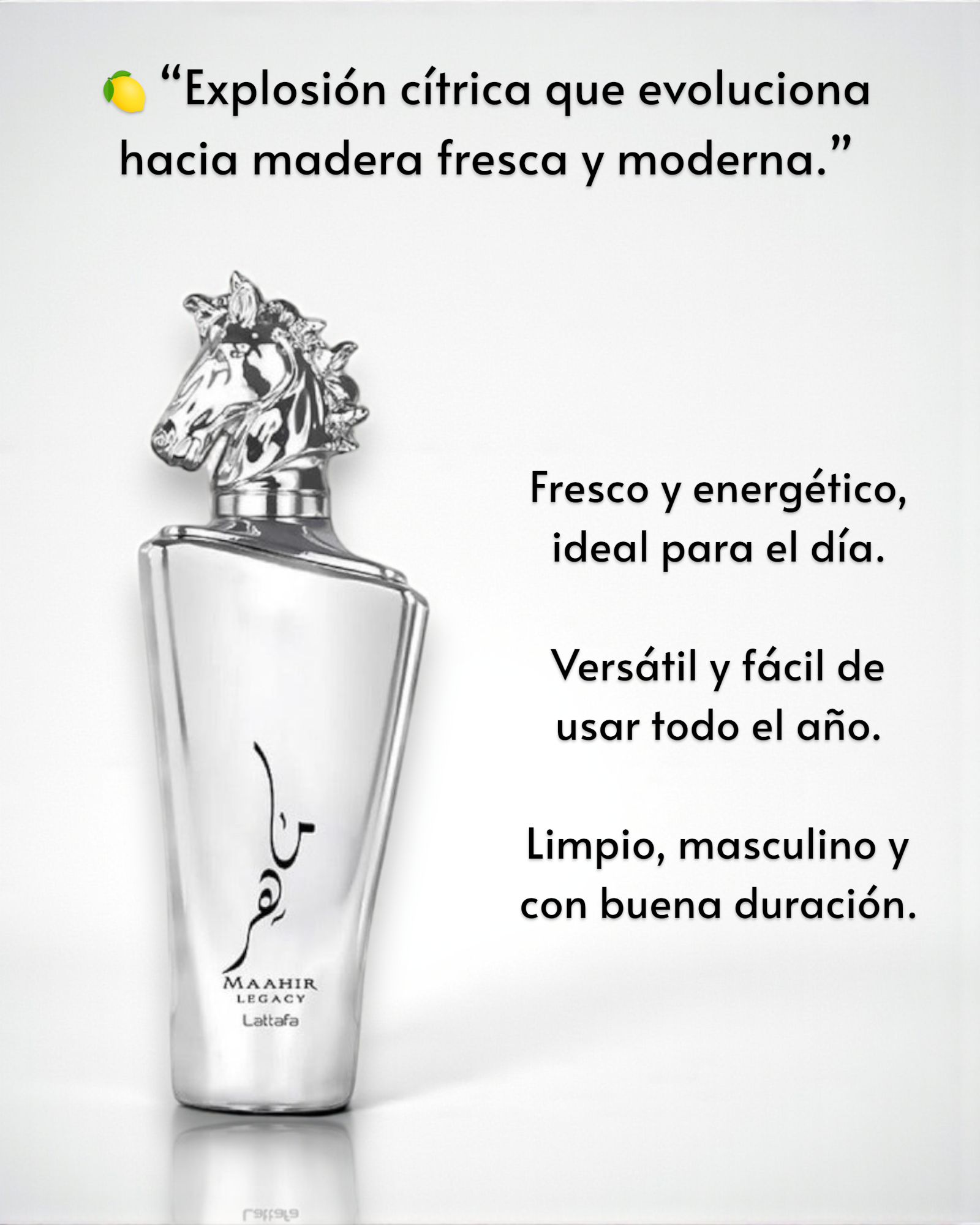 Maahir Legacy de Lattafa es una fragancia aromática fresca que se abre con notas cítricas de lima, toronja, lavanda, menta y piña, ofreciendo una introducción vibrante y energizante. En el corazón, la baya de enebro, el romero, el geranio y el incienso aportan una faceta aromática y especiada. La base combina ambroxan, musgo de roble, vetiver, haba tonka y cashmeran, proporcionando una profundidad amaderada y cálida.