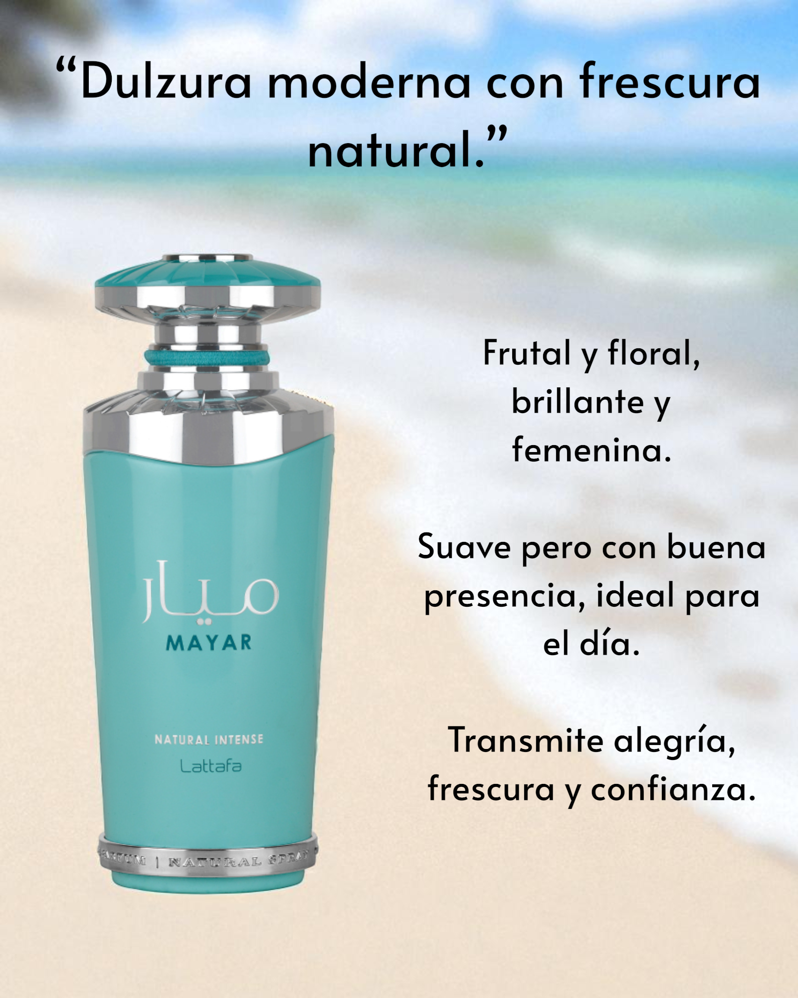Mayar Natural Intense de Lattafa es una fragancia ligera y refrescante que arranca con mandarina verde, higo, melón y agua de coco jugosa. En el corazón, florece la elegancia acuática del loto, lirio de agua y jazmín. La base aporta suavidad con vainilla, almizcle limpio, sándalo cremoso y un toque de ambroxan sutil.