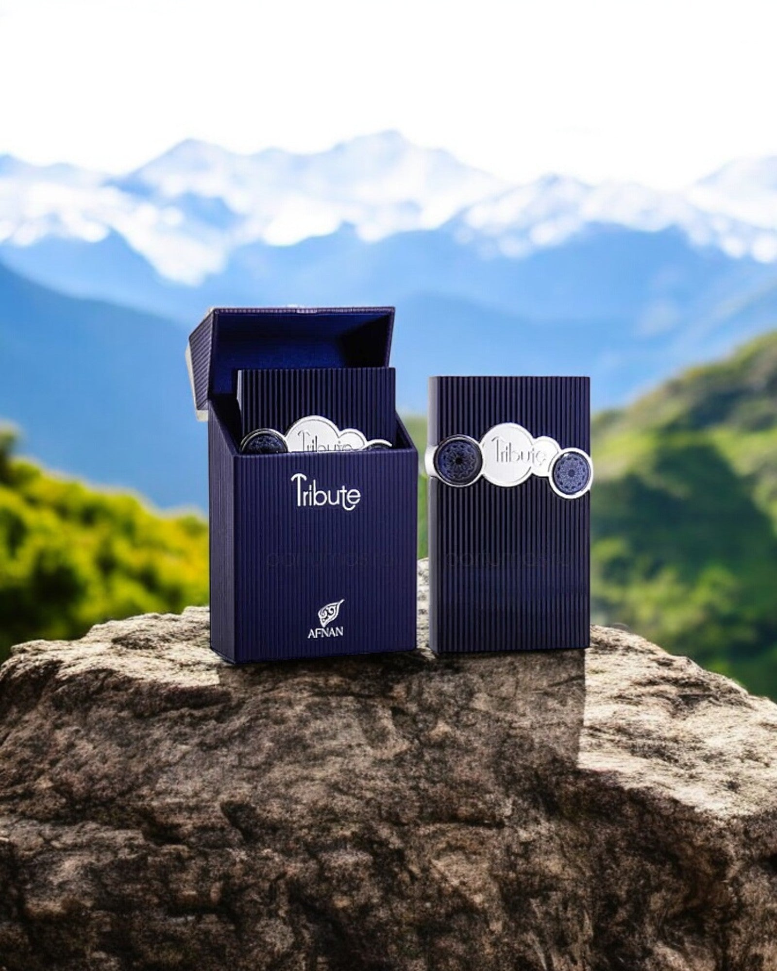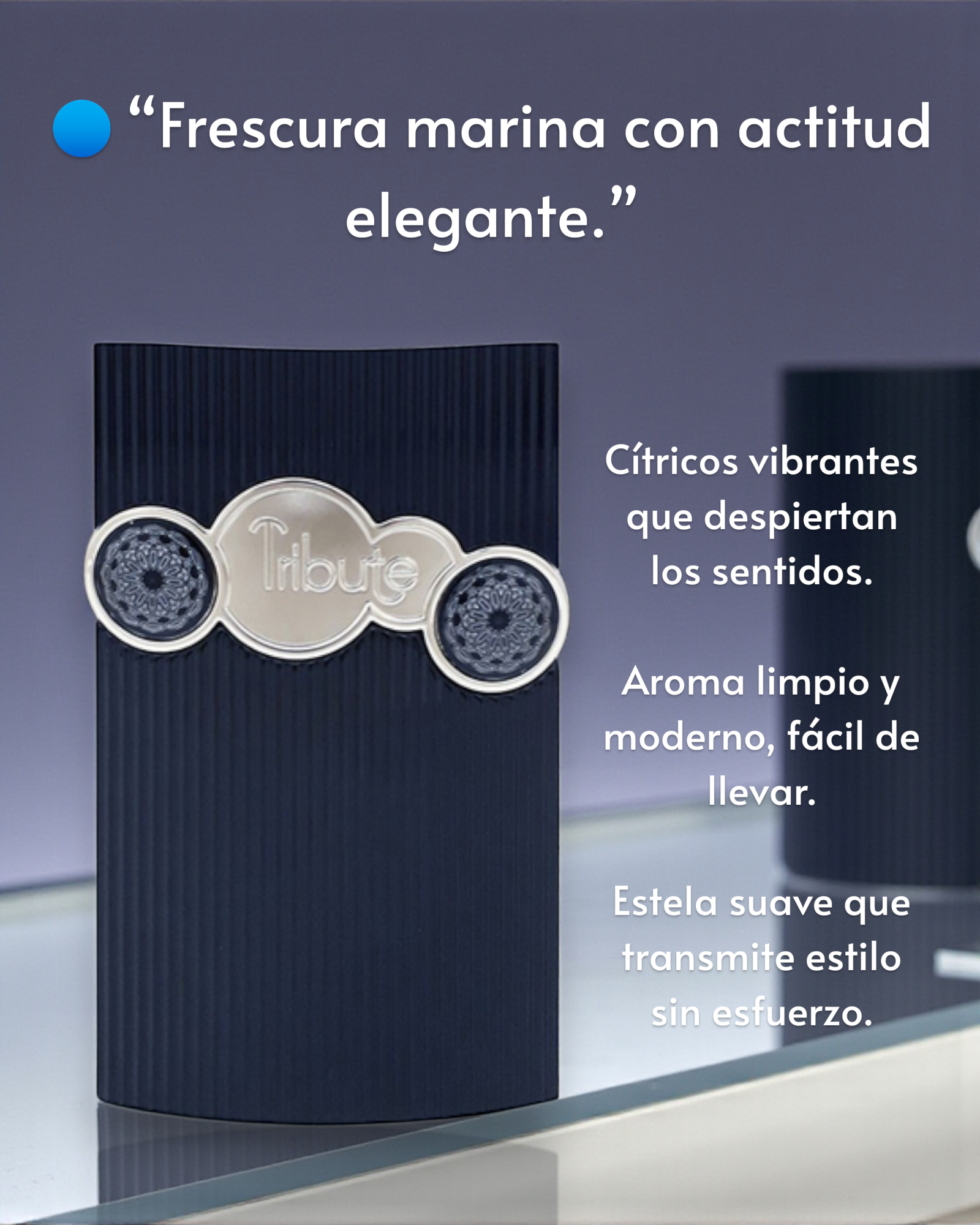 Tribute Blue de Afnan es una fragancia oriental fougère que combina la frescura de la bergamota con la calidez de la nuez moscada y las semillas de pimienta. En su corazón, el ámbar y la madera de cachemira aportan una riqueza aterciopelada, mientras que en la base, el almizcle, las maderas blancas, el vetiver y el incienso crean una estela profunda y duradera. Es la elección perfecta para quienes buscan una fragancia versátil que equilibre frescura y profundidad.