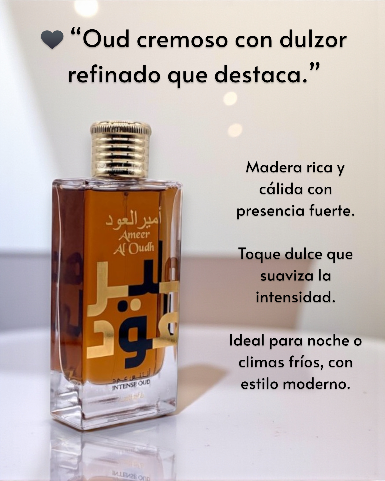 Ameer Al Oudh Intense Oud de Lattafa es una fragancia oriental que destaca por su combinación de notas amaderadas y dulces. Se abre con notas de madera y oud, seguidas de un corazón de azúcar y vainilla que aportan una dulzura envolvente. En el fondo, el oud se mezcla con sándalo y notas herbales, creando una base cálida y sofisticada que perdura en la piel.