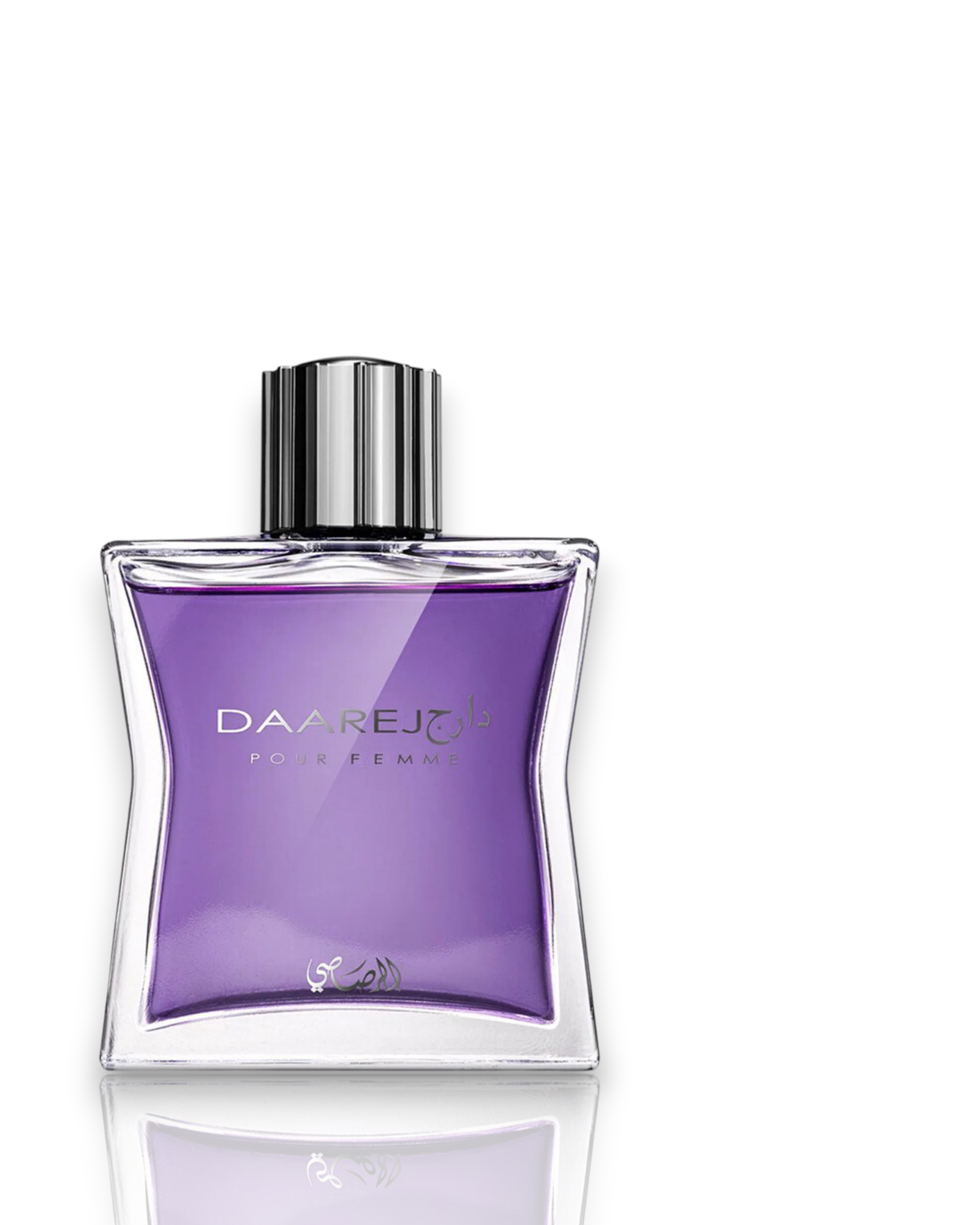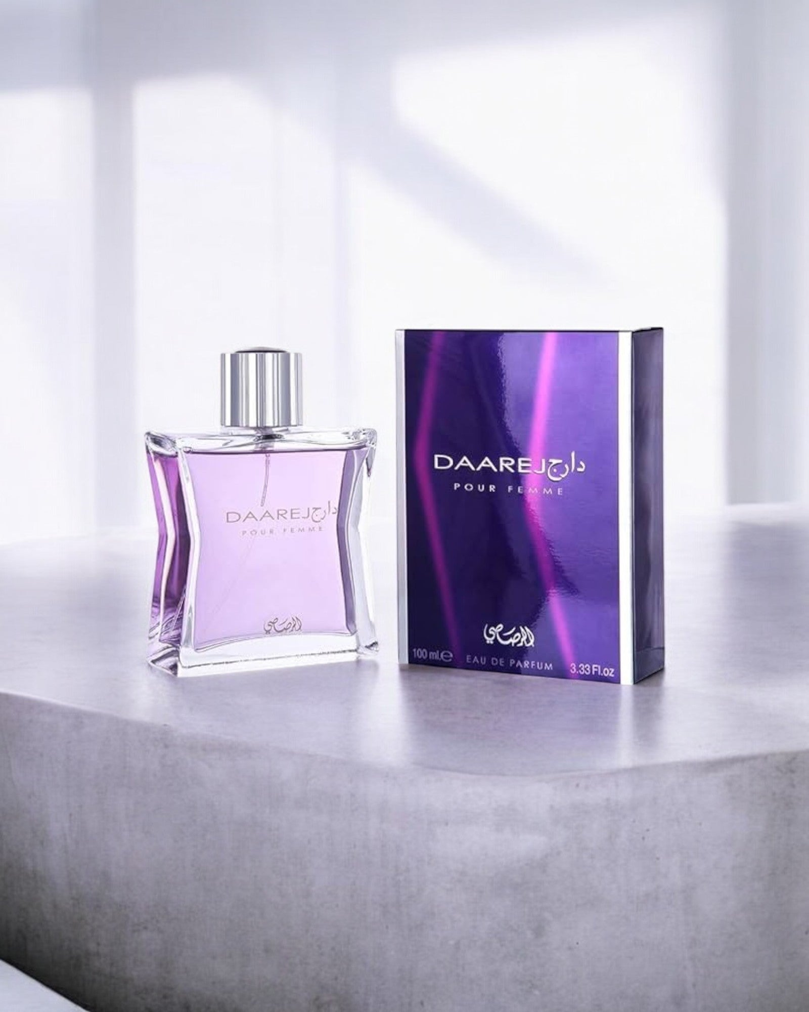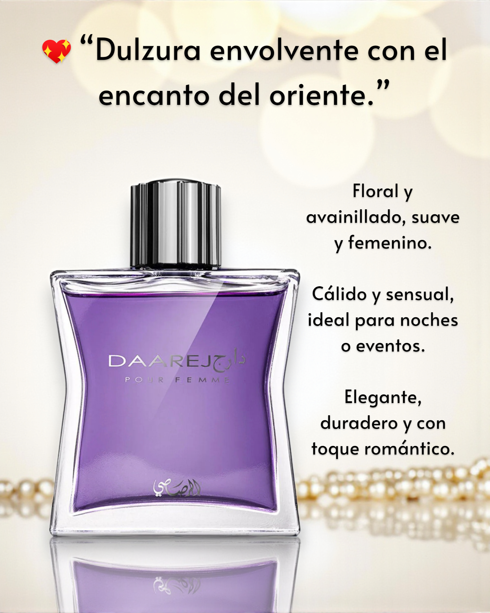 Daarej pour Femme de Rasasi es una fragancia de la familia olfativa Floral Frutal Gourmand para mujeres. Se abre con notas de durazno, naranja, notas verdes y bergamota, ofreciendo una introducción dulce y afrutada. En el corazón, el heliotropo, la orquídea, la tuberosa, el jazmín y el lirio de los valles aportan una mezcla floral rica y femenina. La base combina caramelo, vetiver, almizcle, sándalo, ámbar y pachulí, creando una estela cálida y envolvente.