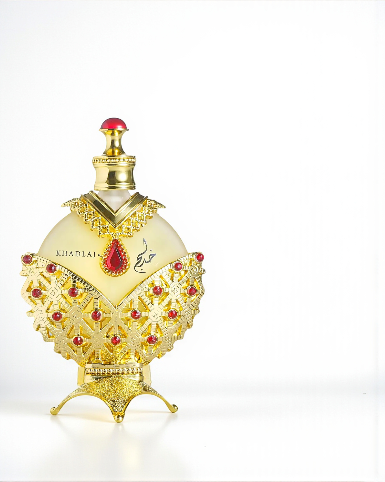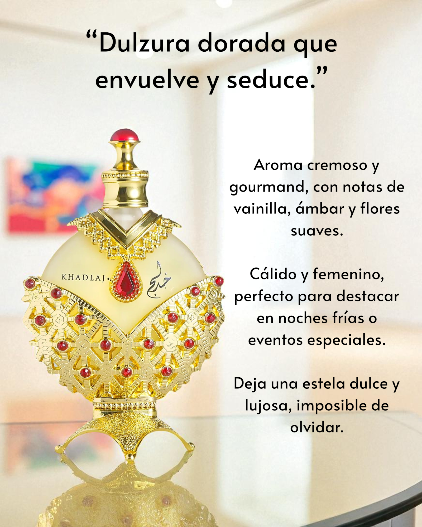 Hareem Al Sultan Gold de Khadlaj es una fragancia dulce, femenina y luminosa que combina frutas tropicales con flores suaves. Su salida mezcla bergamota chispeante con jazmín y peonía. El corazón revela un cóctel jugoso de piña, ciruela y melocotón que se siente vibrante y sofisticado. En el fondo, un velo de almizcle, sándalo y pachulí aporta suavidad y sensualidad. Es una fragancia alegre que transmite frescura y elegancia sin esfuerzo.