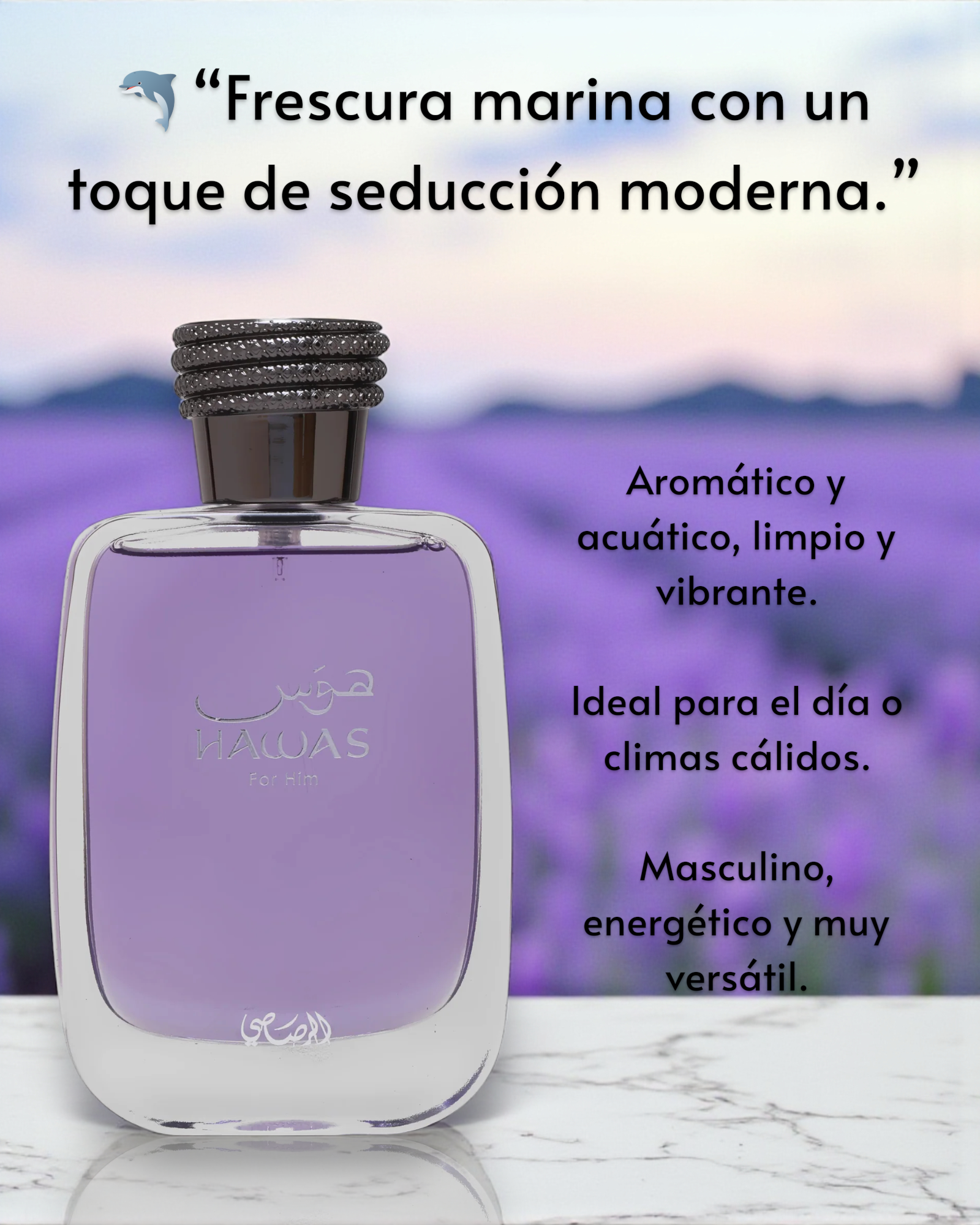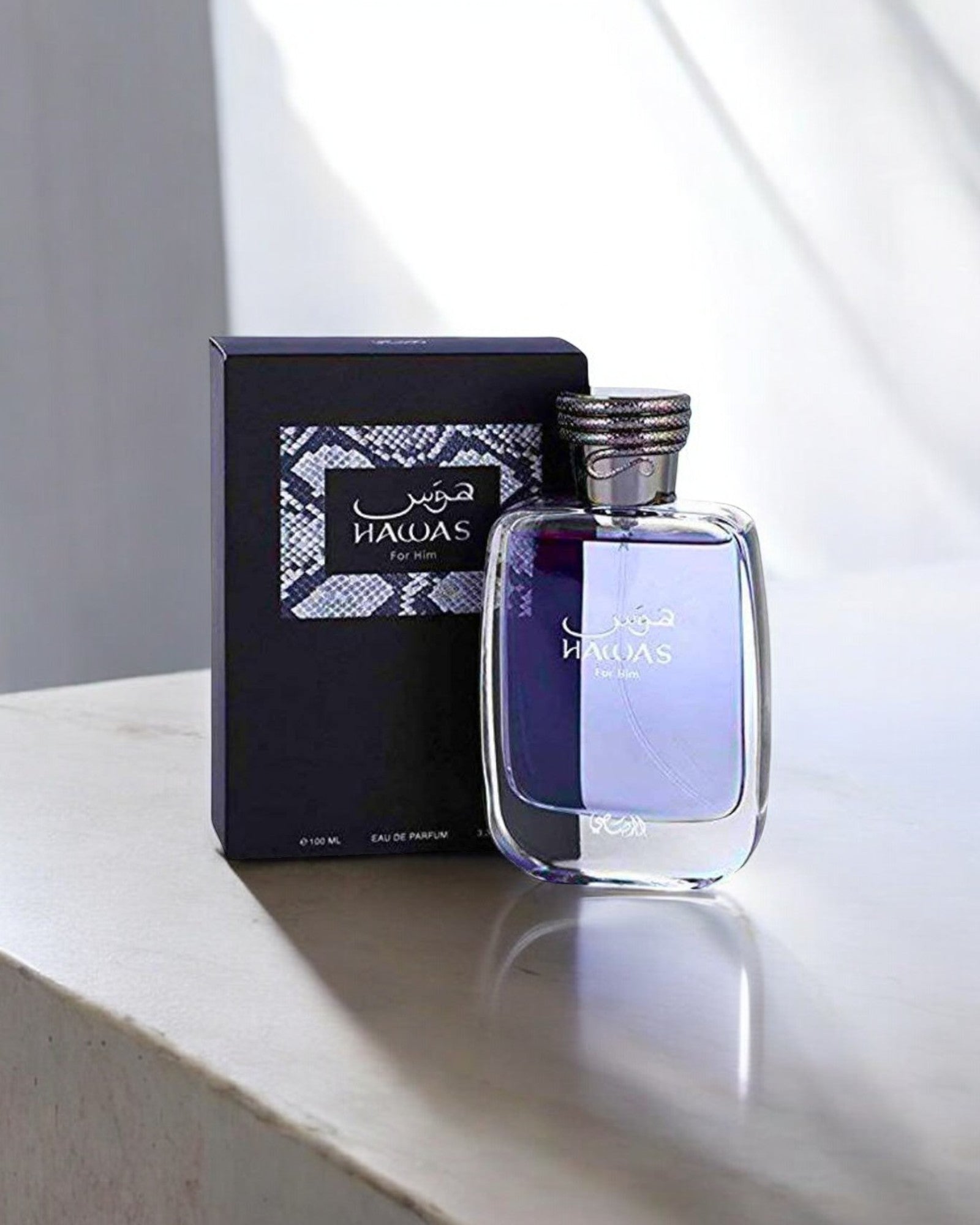Hawas for Him de Rasasi es una fragancia de la familia olfativa Aromática Acuática para hombres, lanzada en 2015. Se abre con notas frescas y afrutadas de manzana, bergamota, limón y canela, proporcionando una introducción vibrante y energizante. En el corazón, las notas acuáticas se mezclan con ciruela, flor de azahar del naranjo y cardamomo, aportando una faceta especiada y acuática. La base combina ámbar gris, almizcle, pachulí y maderas flotantes, creando una estela cálida y amaderada que completa la composición.
