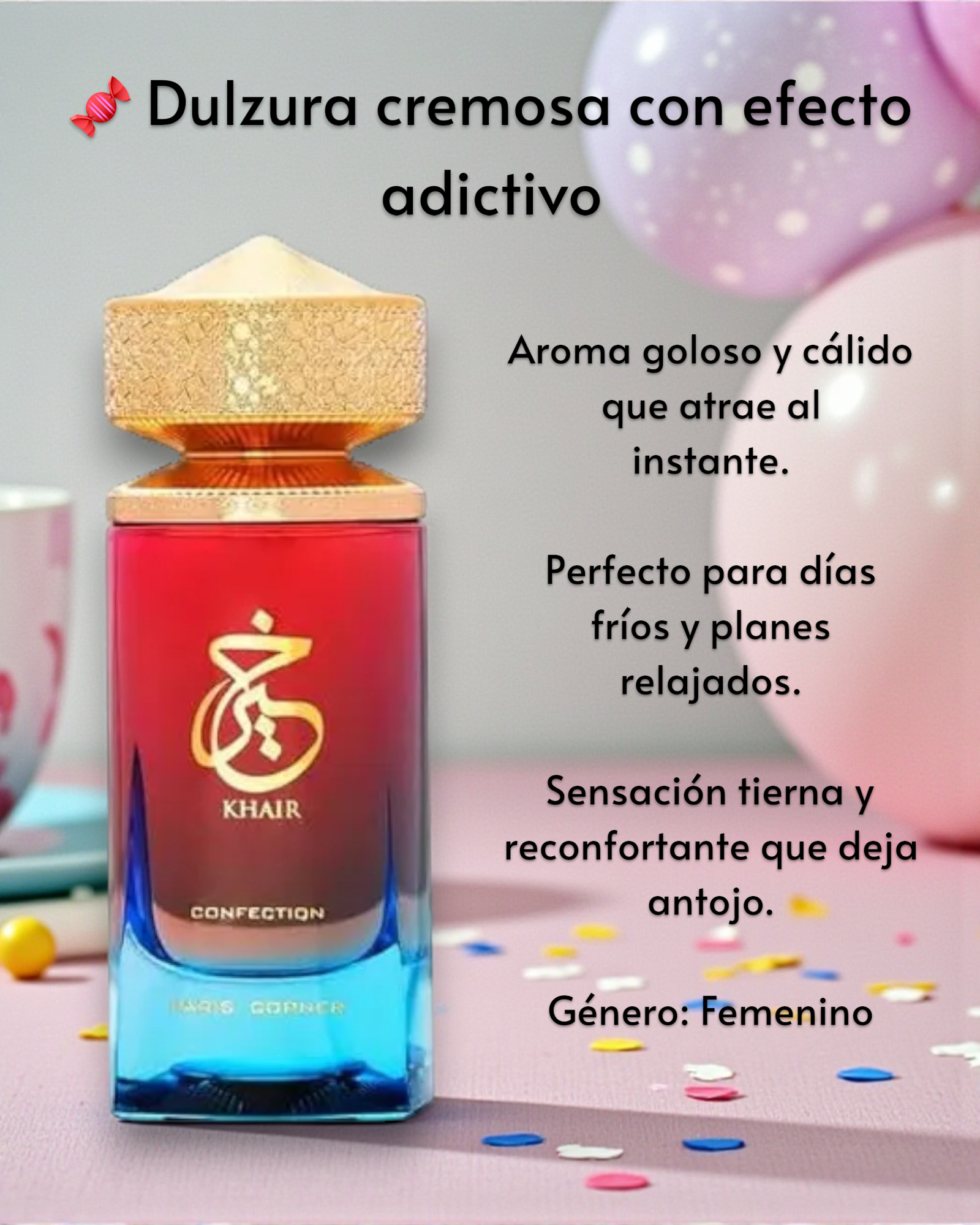 Khair Confection es una fragancia que recuerda a un postre dulce y acogedor: abre con la frescura de pera madura y la suavidad cremosa de nata montada, evocando dulces recuerdos de golosinas y postres. En su corazón, las flores delicadas como el jazmín y el ylang‑ylang se combinan con un toque aterciopelado de cachemira, aportando feminidad, elegancia y un matiz floral‑cremoso. La base — compuesta por vainilla, malvavisco y madera de sándalo — deja una estela cálida, dulce y reconfortante que envuelve suavemente la piel. El resultado es un aroma dulce‑gourmand, cálido y acogedor, ideal para quienes buscan un perfume cómodo, dulce y versátil.