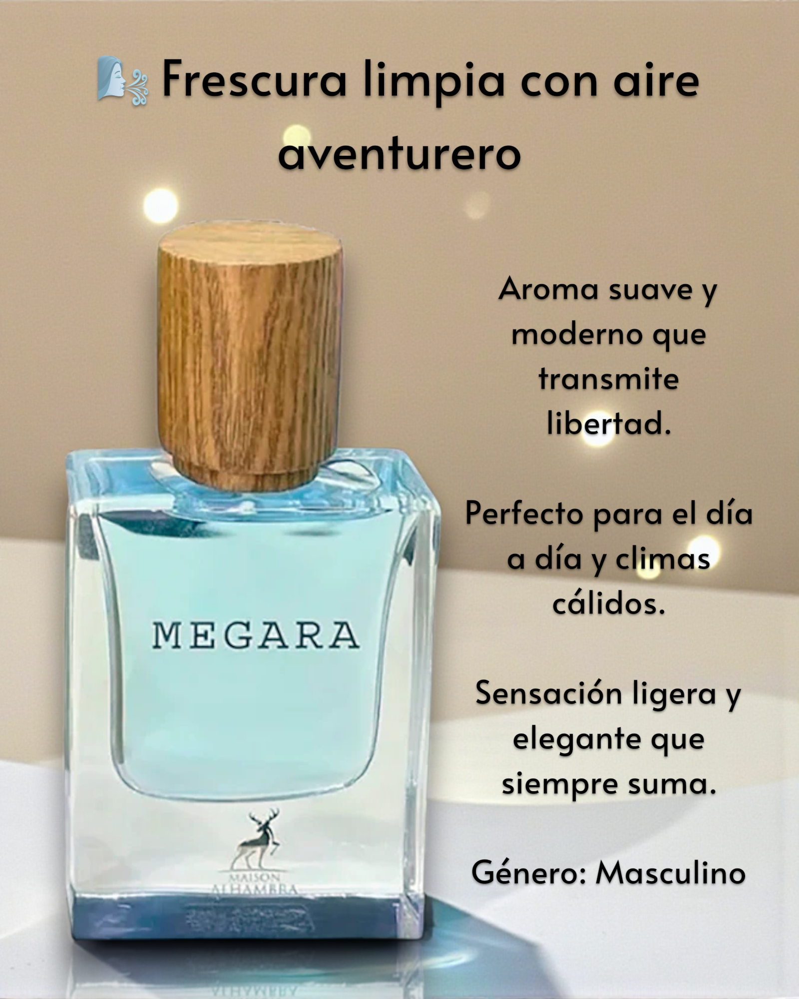 Megara es una fragancia fresca, vibrante y marina, pensada para quienes buscan un aroma limpio y refrescante que evoque brisa del mar y libertad. Su apertura chispea con cítricos brillantes — bergamota y limón — despertando los sentidos con energía y vitalidad. En su corazón se despliegan notas acuáticas y verdes: algas marinas, vibra marina y matices ozónicos, evocando el olor del océano y la naturaleza. Finalmente, su base de ámbar moderno, almizcle y cedro aporta profundidad, suavidad y elegancia, dejando una estela limpia, persistente y agradable.