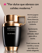 Odyssey Femme de Armaf es una fragancia oriental floral que combina notas dulces y florales para una experiencia olfativa sofisticada y envolvente. Se abre con notas de ciruela, gardenia, miel, bergamota y nardos, ofreciendo una introducción dulce y floral. En el corazón, el lirio de los valles, el jazmín, la rosa y el azafrán aportan una mezcla floral que añade profundidad y elegancia. La base de cacao, haba tonka, almizcle y pachulí proporciona una fijación cálida y duradera.