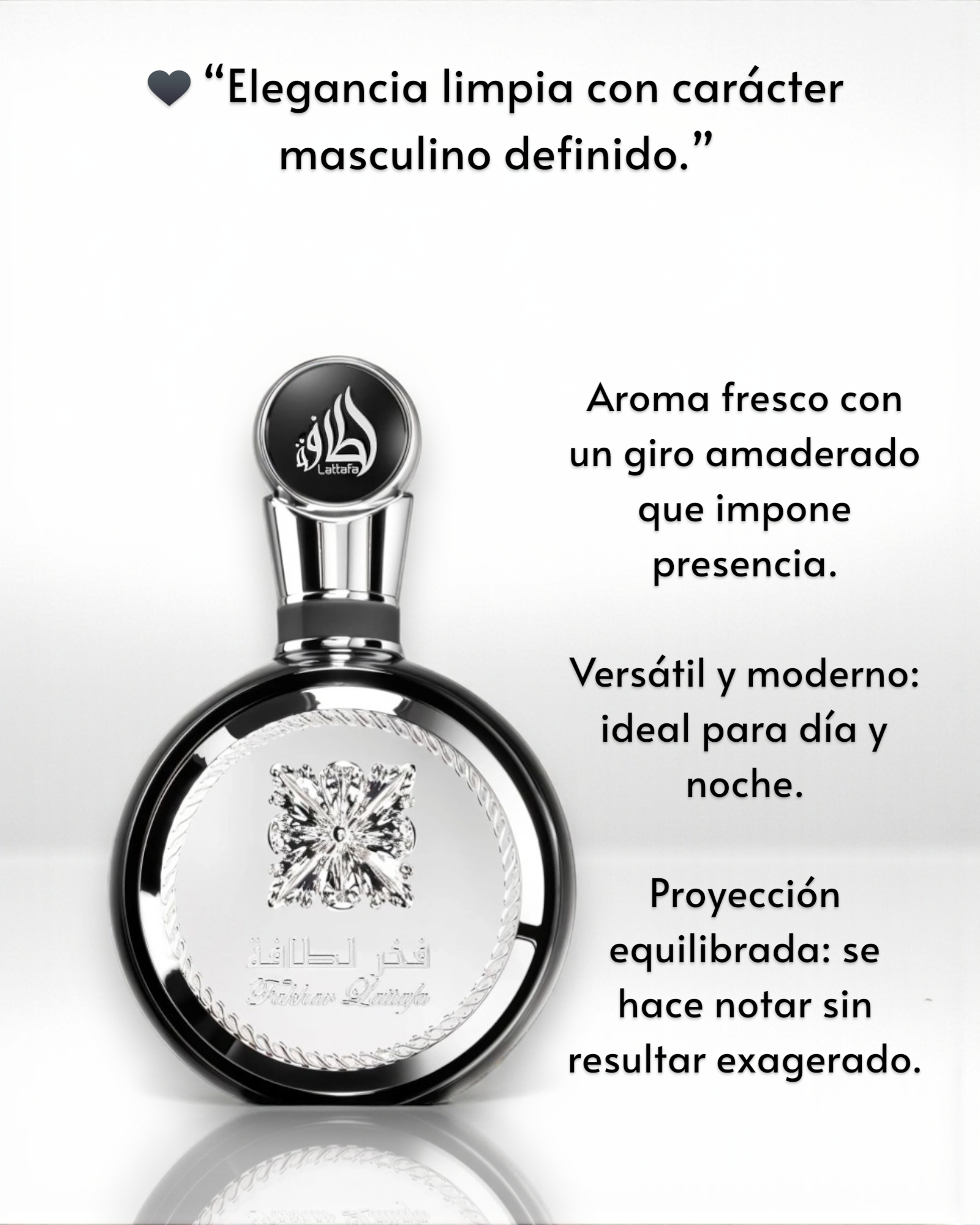 Fakhar Black de Lattafa es una fragancia aromática fougère que se abre con notas frescas de manzana, jengibre y bergamota, ofreciendo una introducción vibrante y energizante. En el corazón, la salvia, la baya de enebro y el geranio aportan una faceta aromática y ligeramente especiada. La base está compuesta por vetiver, tonka y cedro, proporcionando una profundidad amaderada y terrosa.