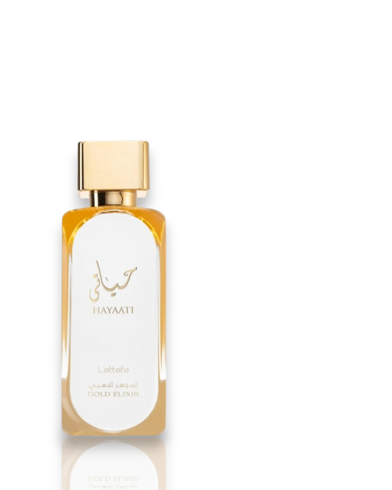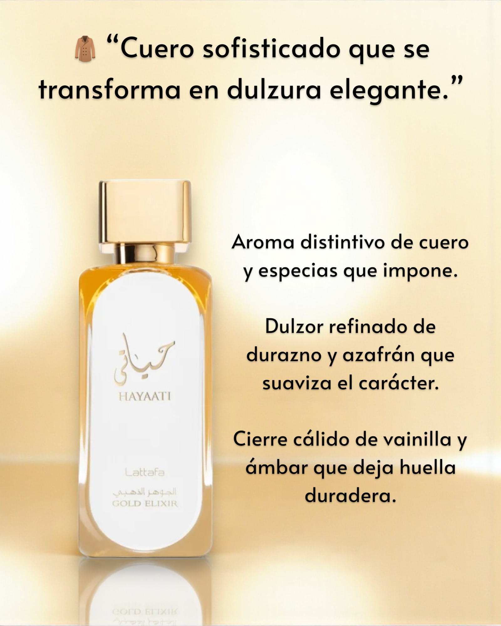 Hayaati Gold Elixir de Lattafa es una fragancia oriental amaderada que se abre con notas cítricas de bergamota y pomelo, complementadas por la dulzura del cassis. En el corazón, el cuero se mezcla con el melocotón y el azafrán, aportando una riqueza afrutada y especiada. La base combina vainilla, ámbar, almizcle y vetiver, proporcionando una profundidad cálida y terrosa.
