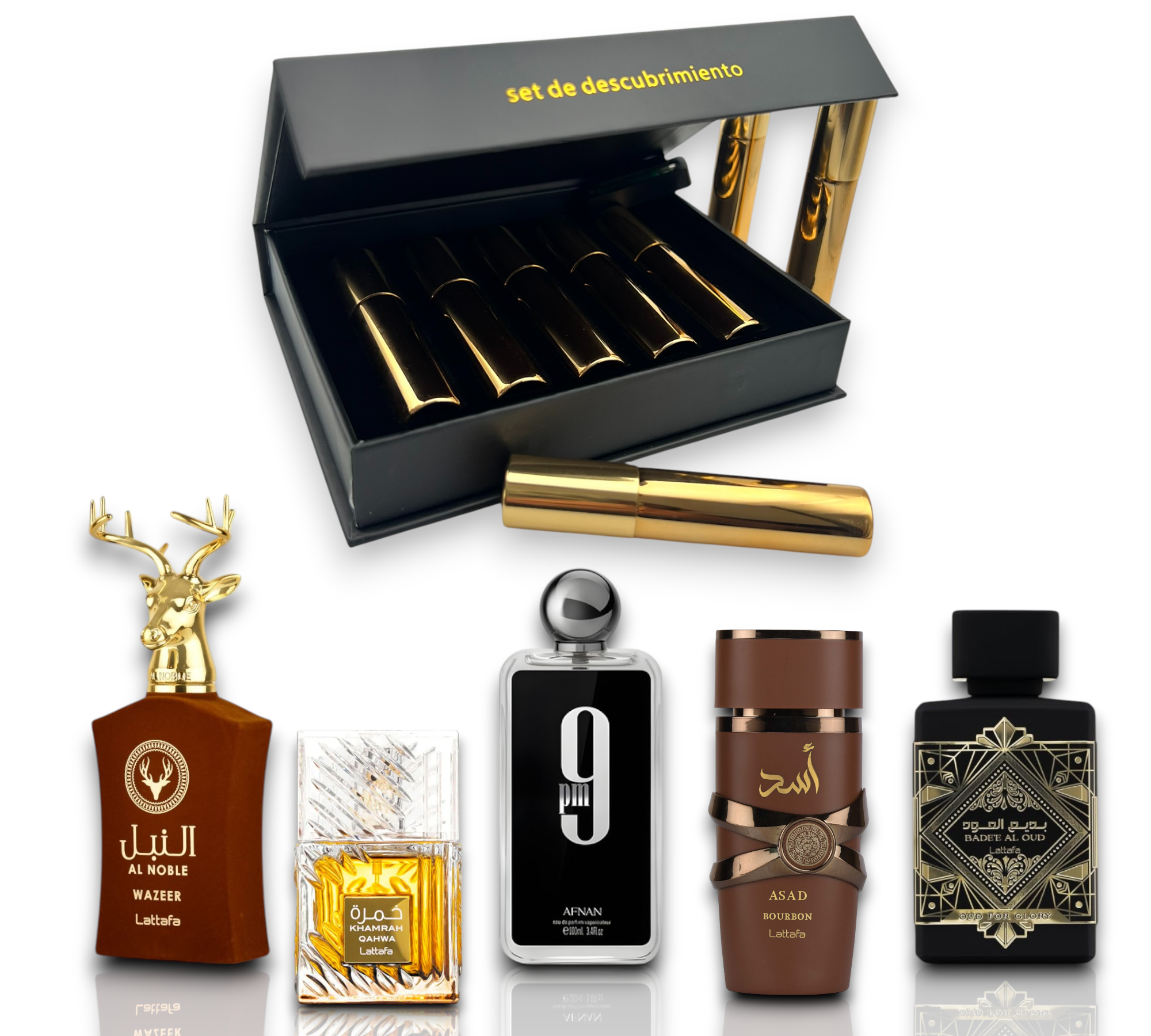 “🔥 El otoño pide intensidad, y este set de cinco perfumes árabes masculinos lo tiene todo: desde la elegancia imponente de Al Noble Wazeer hasta la calidez especiada de Khamrah Qawa, el magnetismo nocturno de 9 PM, la potencia envolvente de Asad Bourbon y la profundidad única de Oud for Glory. Una selección que combina fuerza, misterio y sofisticación.”