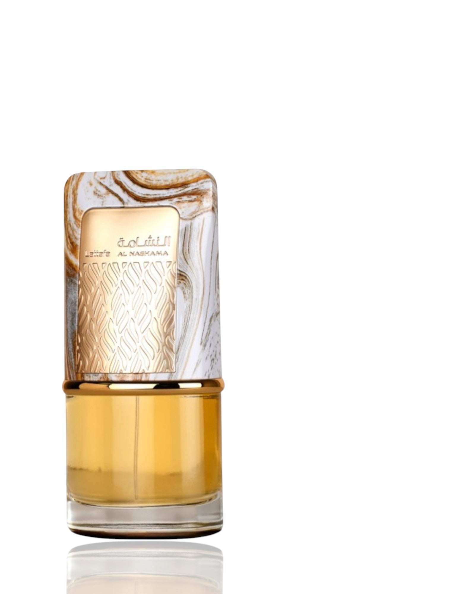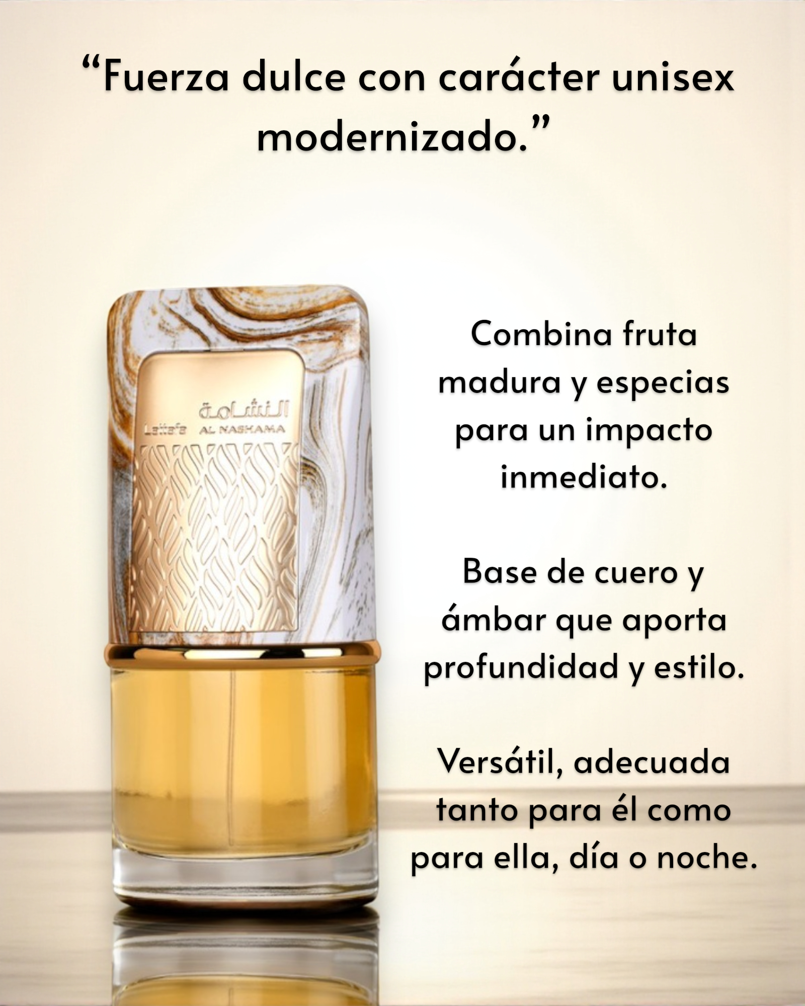 Al Nashama de Lattafa es una fragancia que combina notas especiadas y afrutadas para crear una experiencia olfativa sofisticada. Se abre con una vibrante mezcla de bergamota, pimienta rosa y salvia, ofreciendo una introducción fresca y especiada. En el corazón, la ciruela, la pimienta negra y el jazmín aportan profundidad y un toque dulce. Finalmente, las notas de fondo de cuero Saffiano, ámbar, pachulí y musgo proporcionan una base cálida y duradera que envuelve los sentidos.