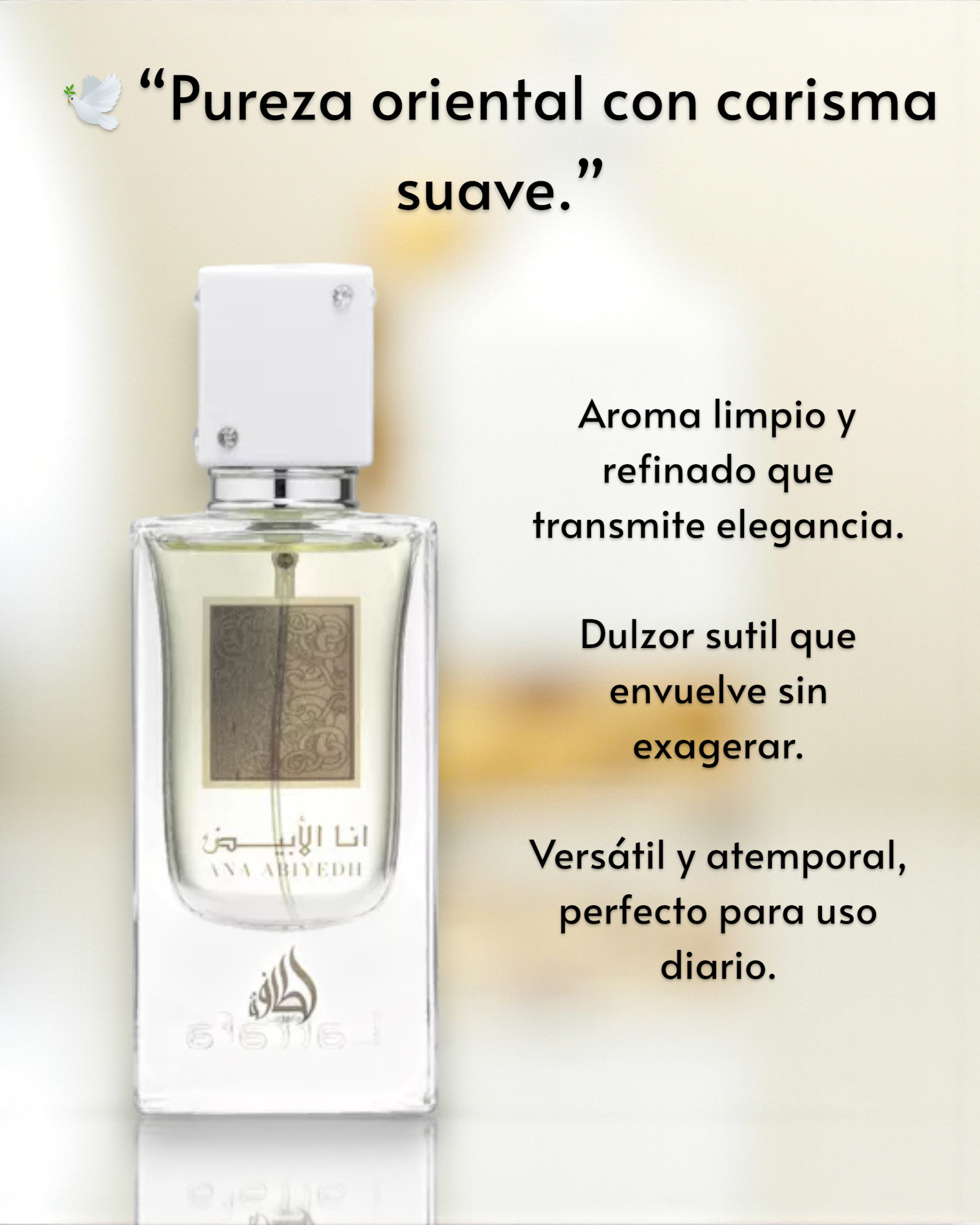 Ana Abiyedh de Lattafa es una fragancia vibrante y dulce que combina notas cítricas y afrutadas con toques ambarados y almizclados. Se abre con una mezcla refrescante de bergamota y naranja, que da paso a un corazón delicioso de vainilla y pera. Finalmente, las notas de fondo de almizcle y ámbar aportan profundidad y calidez, creando una experiencia olfativa envolvente y duradera.
