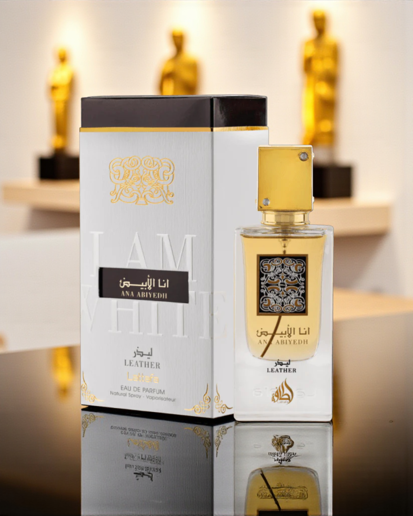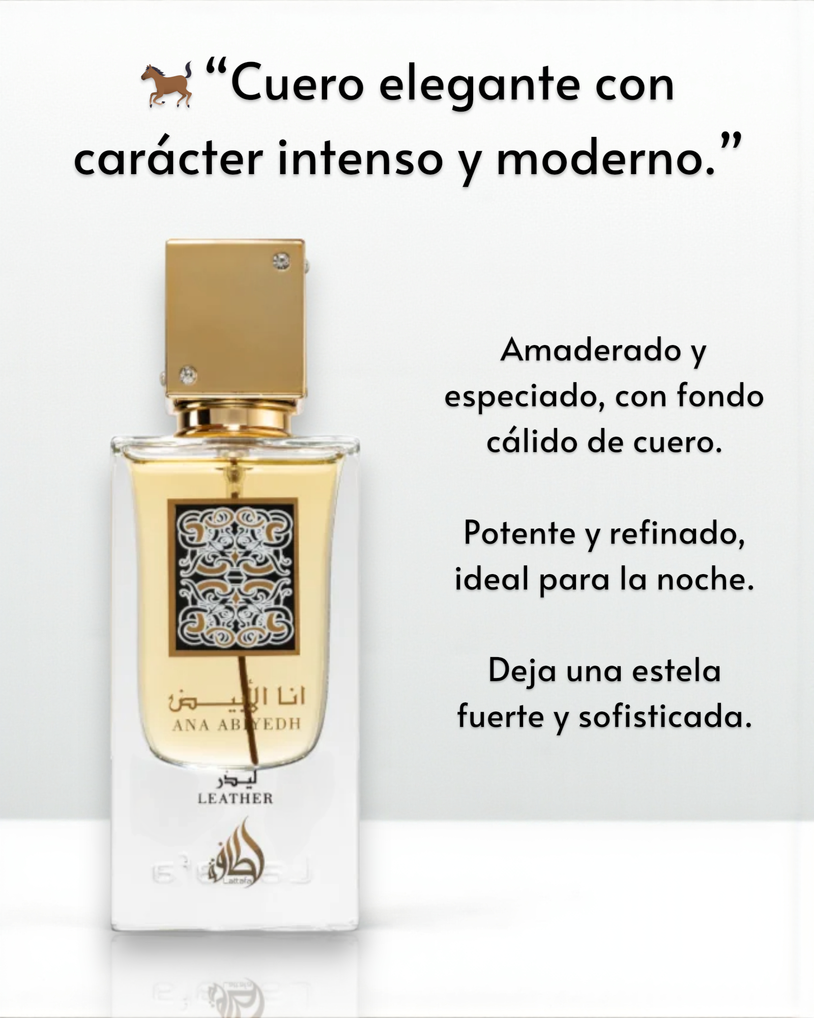 Ana Abiyedh Leather de Lattafa es una fragancia intensa y sofisticada que destaca por su combinación de notas amaderadas y cuero. Se abre con notas de azafrán y frambuesa, seguidas de un corazón de cuero y notas amaderadas que aportan profundidad y carácter. En el fondo, el ámbar y la gamuza crean una base cálida y envolvente que perdura en la piel.