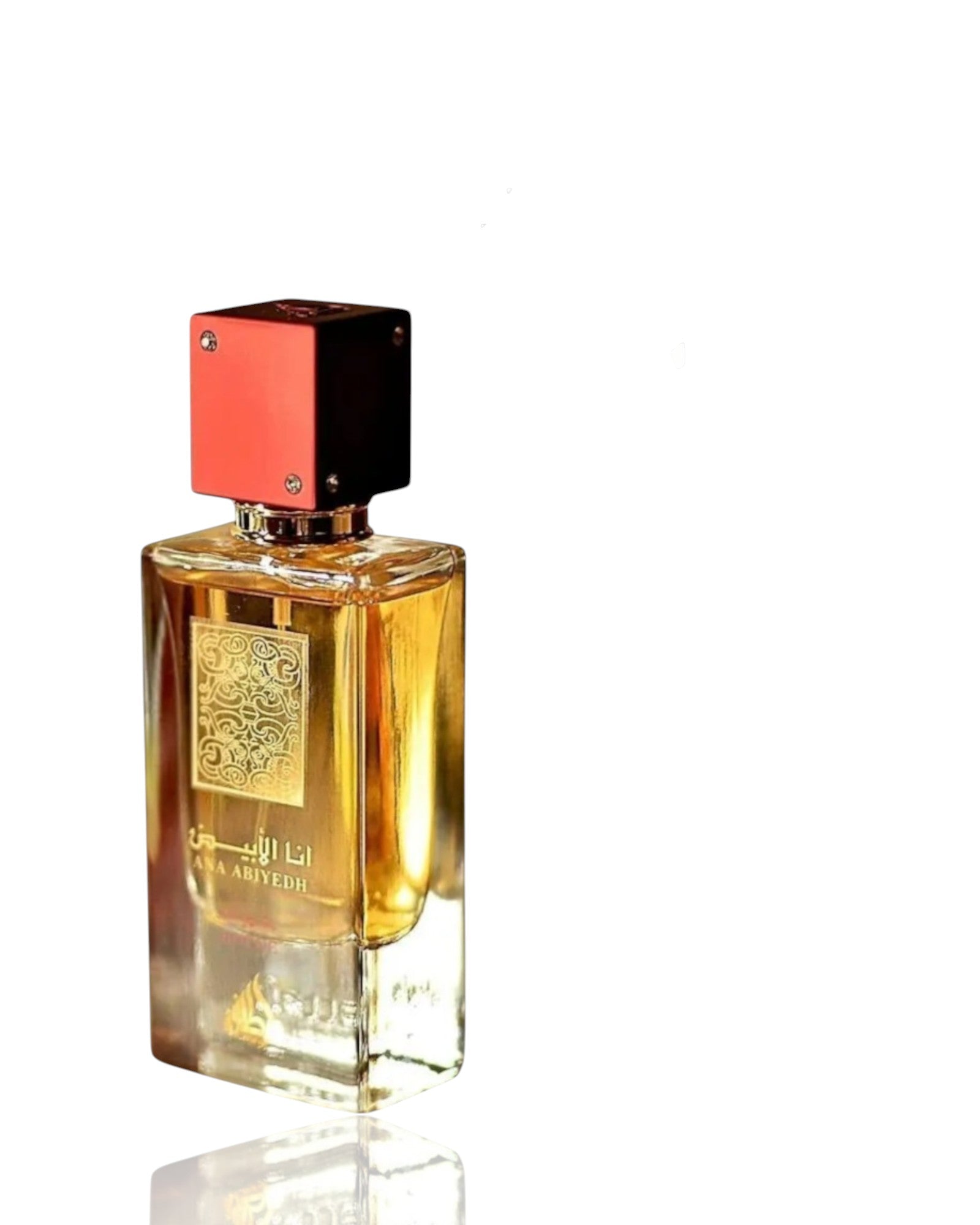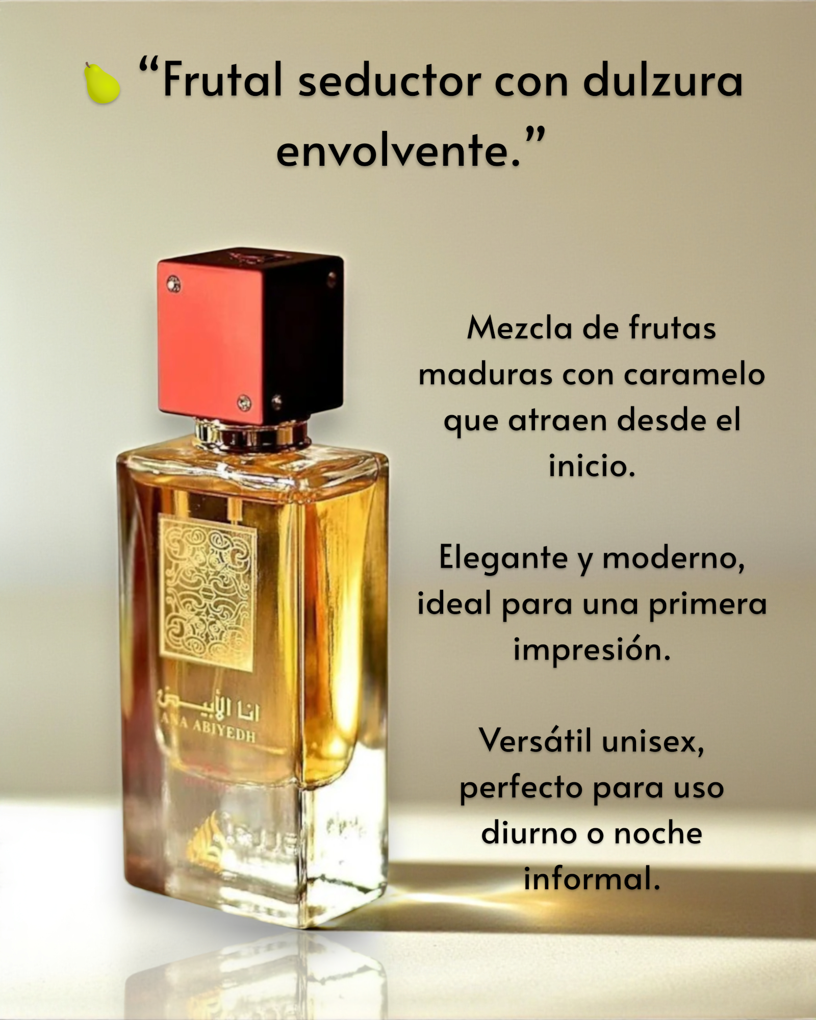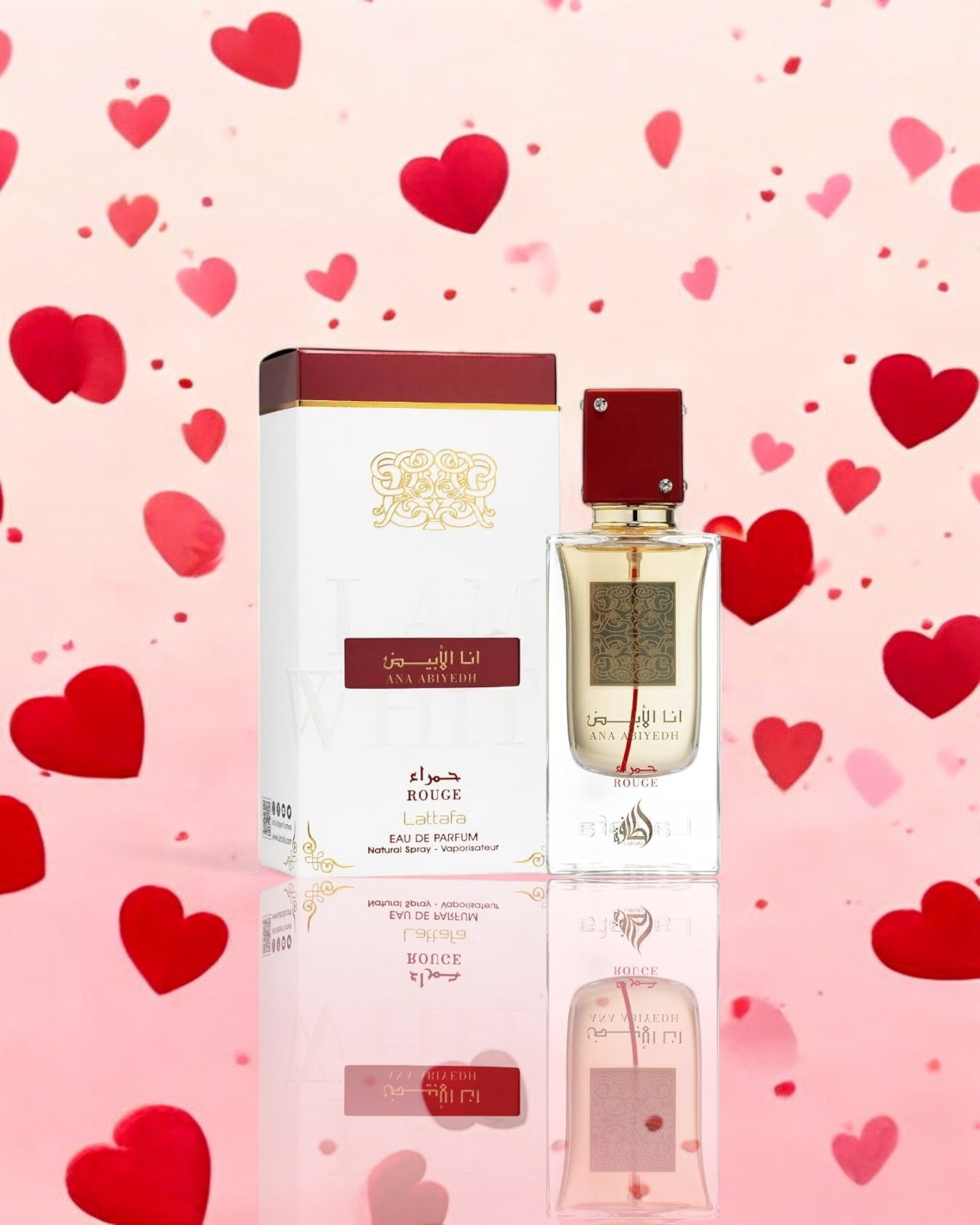 Ana Abiyedh Rouge de Lattafa es una fragancia amaderada y especiada que se abre con notas frescas y afrutadas de pera Nashi, kumquat y bergamota. En el corazón, el caramelo y el geranio aportan una dulzura floral, mientras que el fondo de ámbar gris, almizcle y musgo de roble proporciona una base cálida y terrosa.