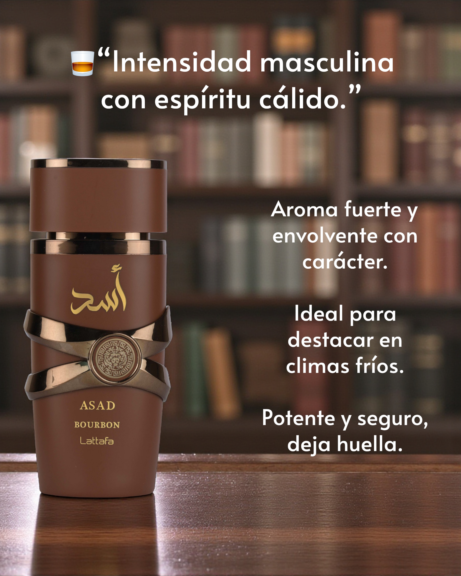 Asad Bourbon de Lattafa inicia con la chispa de la pimienta rosa junto a la suavidad de la lavanda y el toque frutal de ciruela mirabelle. En el corazón, el cacao rico, la nuez moscada especiada y la davana envolvente crean una profundidad cálida y seductora. La base mezcla la dulzura cremosa de la vainilla bourbon, el ámbar dorado y el vetiver terroso, dejando un aroma refinado y adictivo.