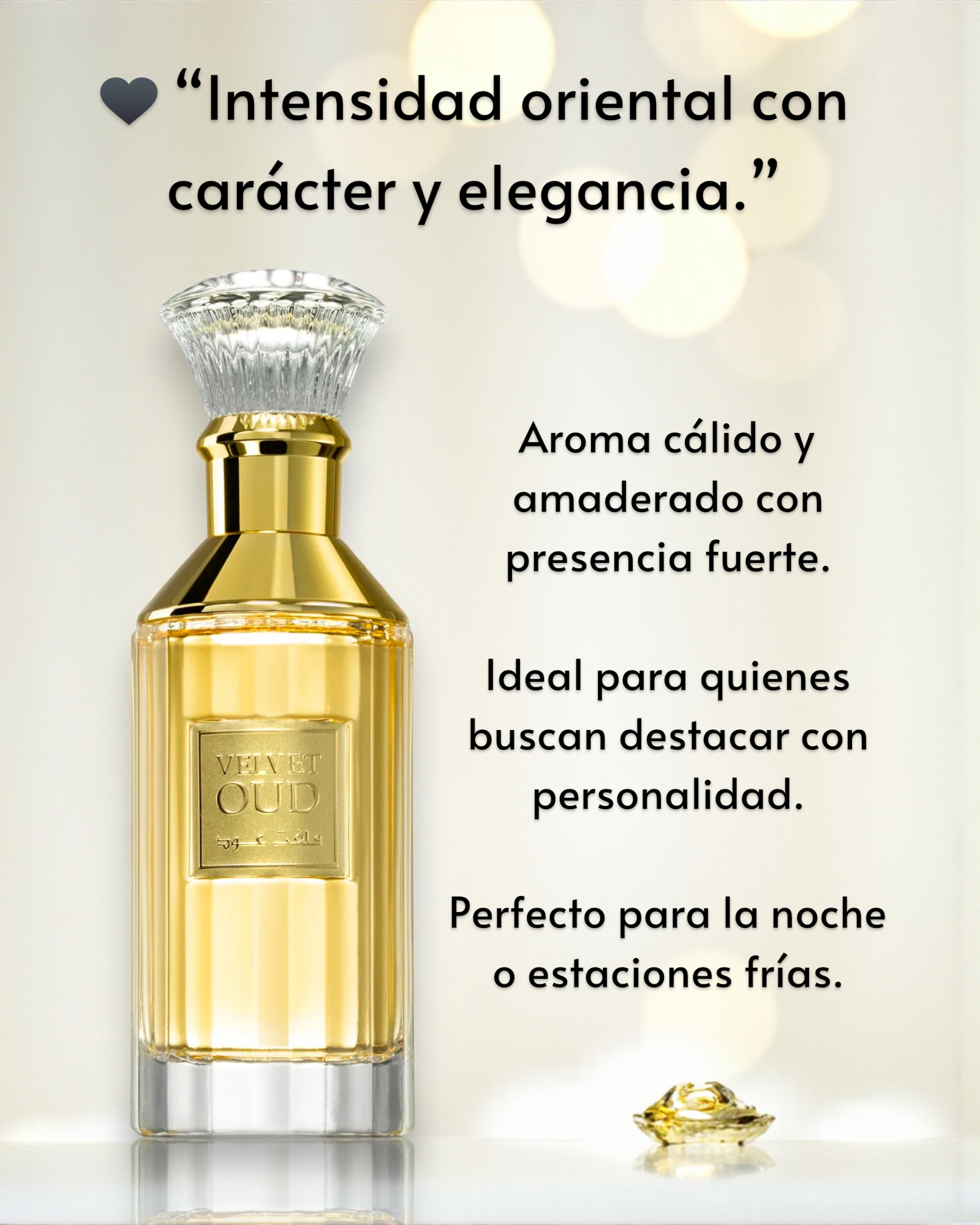 Velvet Oud de Lattafa es una fragancia amaderada y especiada que se abre con notas de cardamomo y bergamota, ofreciendo una introducción fresca y picante. En el corazón, la hoja de violeta y el pachulí aportan una faceta terrosa y floral. La base combina gamuza, oud, ámbar, almizcle y musgo de roble, proporcionando una profundidad cálida y amaderada.