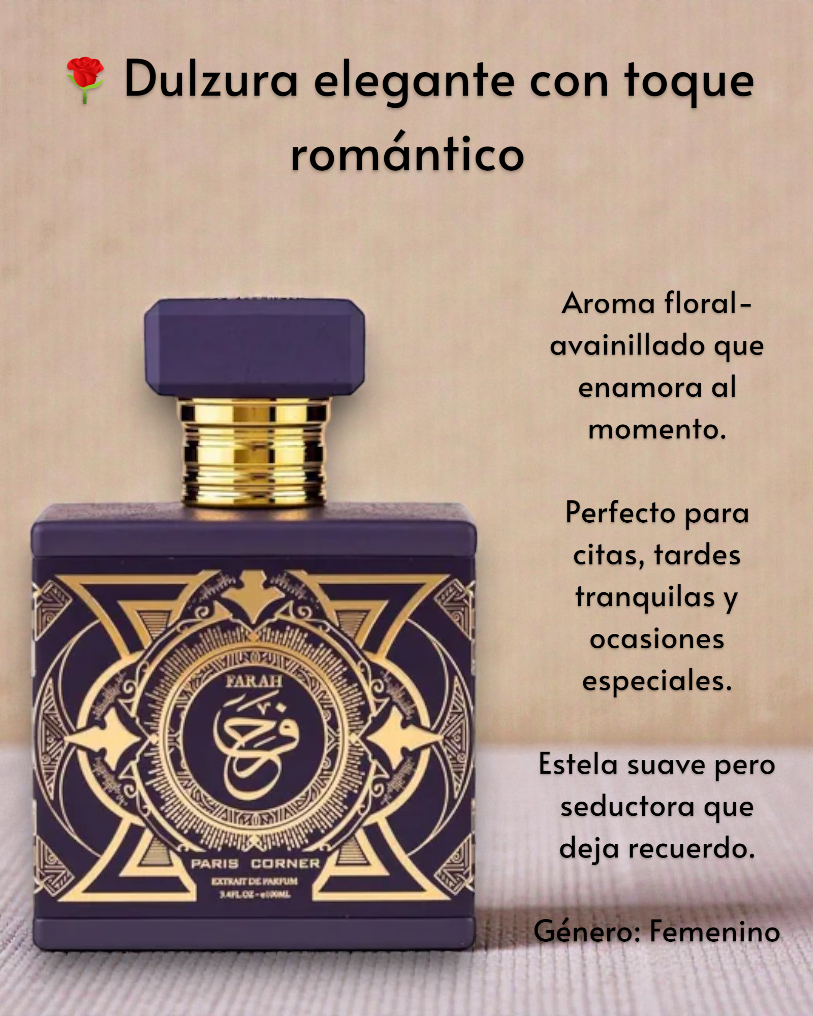 Farah de Paris Corner es una fragancia intensa, cálida y especiada que envuelve los sentidos desde el primer instante. Inicia con un toque vibrante y sensual de ron y azafrán, que aporta una sensación exótica y misteriosa. Al avanzar, emerge un corazón cálido de canela y cedro, añadiendo profundidad, carácter y un aire refinado. Finalmente, su base de tabaco y vainilla cierra con un rastro ahumado‑dulce, sensual y envolvente, dejando una estela persistente que evoca noches de pasión y seducción.