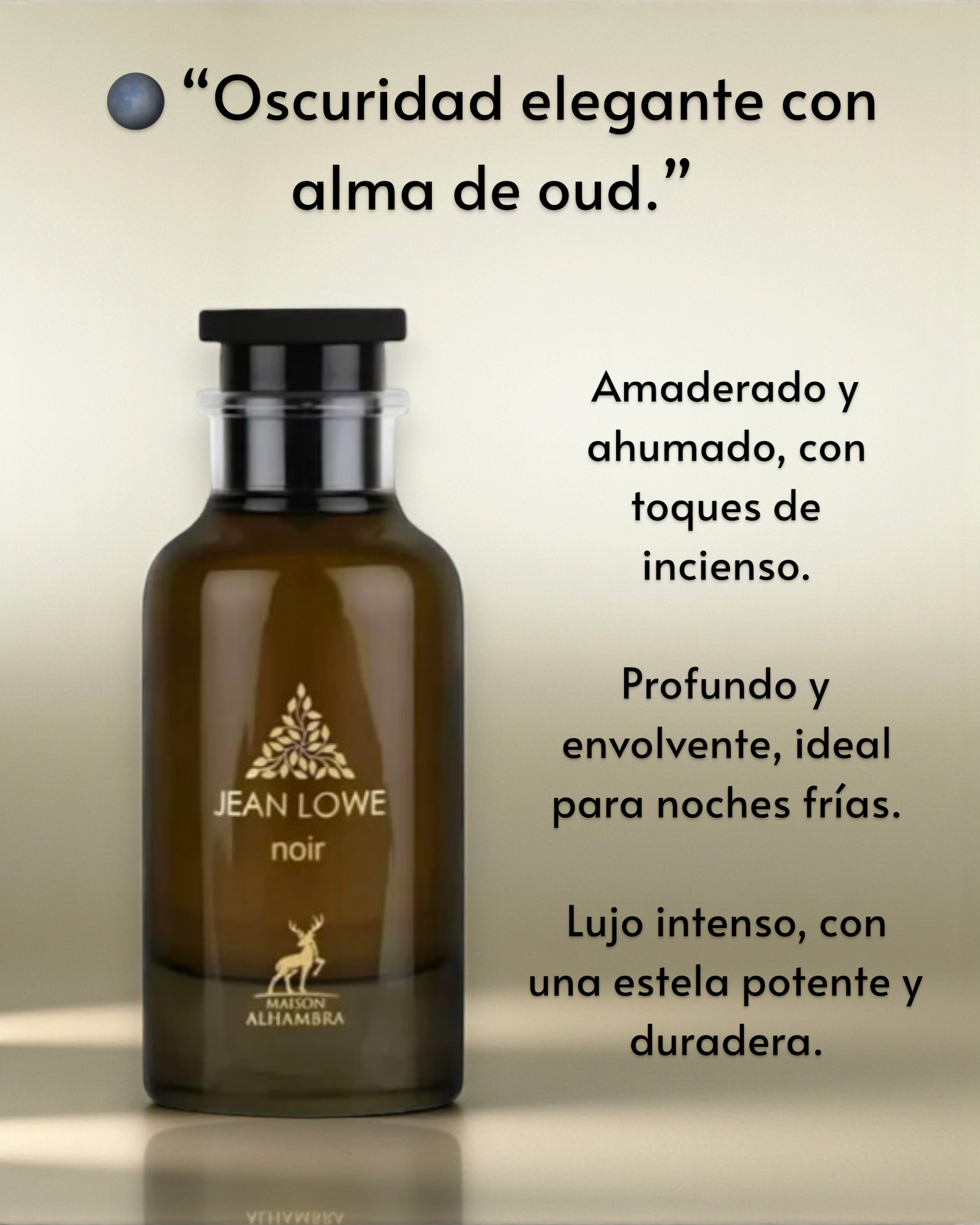 Jean Lowe Noir de Maison Alhambra es una fragancia que destaca por su carácter ahumado y ambarino, enfatizando maderas oscuras y terrosas junto con un persistente humo de incienso. Un acorde floral profundo de rosa añade complejidad, elevándola más allá de las composiciones típicas centradas en oud y cuero. Esta nota floral no es abiertamente femenina ni ligera; más bien, presenta una faceta rica y con matices de cuero. Comparándola con la original de Louis Vuitton, carece de la nota de frambuesa, pero mantiene la esencia del ADN. Es una opción notable para quienes buscan fragancias más oscuras, adecuadas para el invierno. Aunque muchos la reservarán para ocasiones formales y eventos sociales especiales, también podría servir como una fragancia distintiva para alguien con una personalidad misteriosa y reservada.