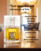 Khamrah Qahwa de Lattafa es una fragancia oriental vainilla que se abre con notas especiadas de canela, cardamomo y jengibre. El corazón presenta una mezcla dulce de praliné, frutas confitadas y flores blancas, aportando una riqueza afrutada y floral. La base combina café, vainilla, haba tonka, benjuí y almizcle, ofreciendo un final profundo y envolvente.
