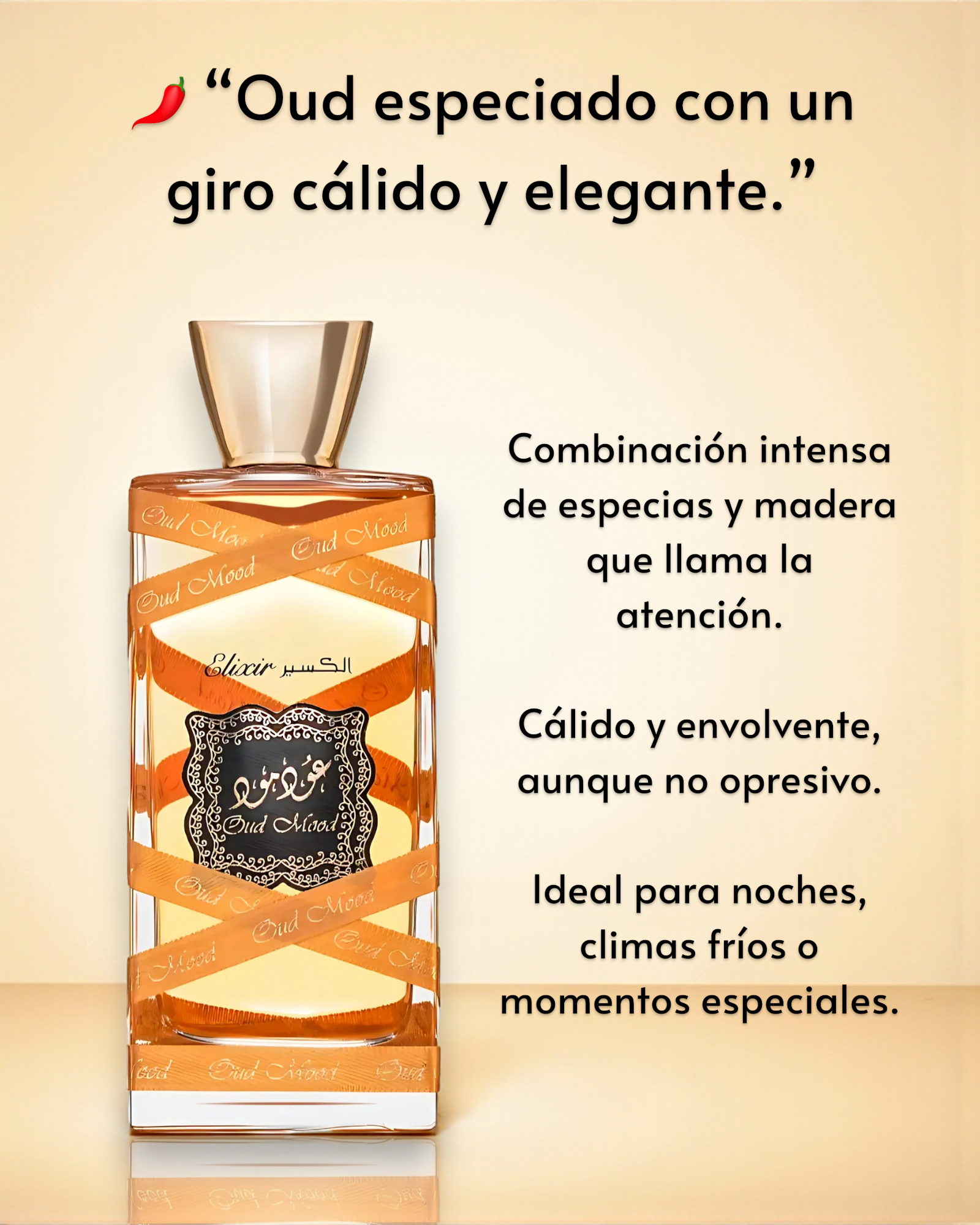Oud Mood Elixir de Lattafa es una fragancia oriental especiada que se abre con notas de azafrán, nuez moscada y canela, ofreciendo una introducción cálida y especiada. En el corazón, el oud, la gamuza y el sándalo aportan una faceta amaderada y suave. La base combina ámbar y vainilla, proporcionando una profundidad dulce y envolvente.