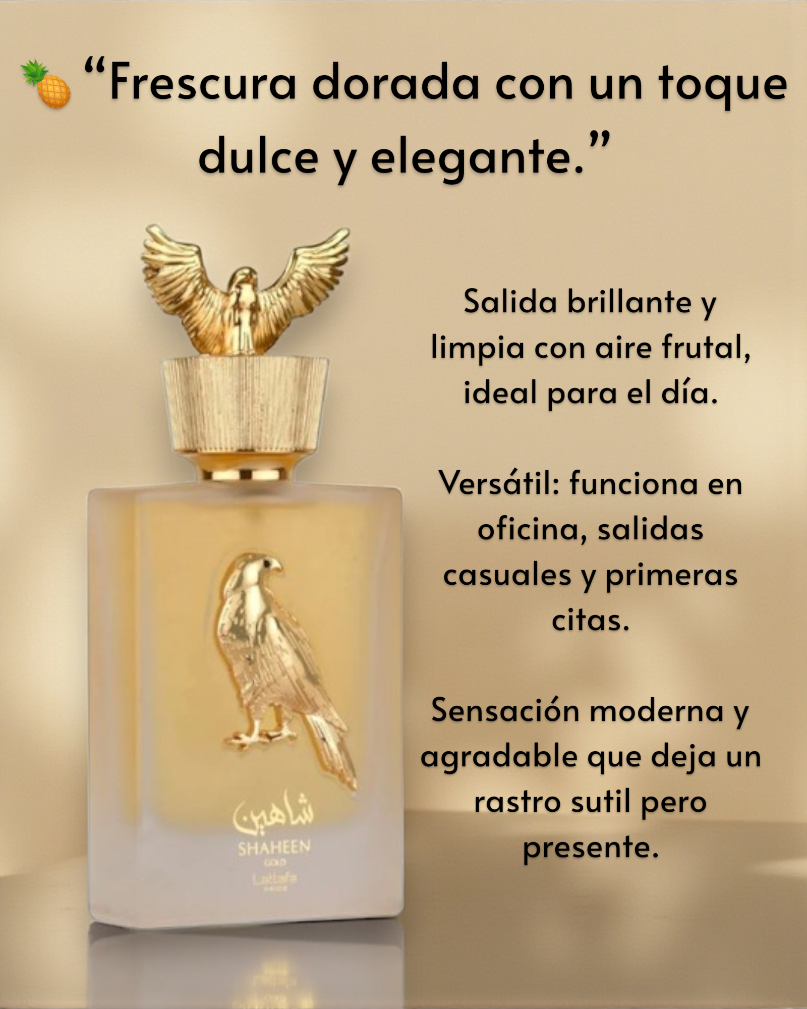 Shaheen Gold de Lattafa es una fragancia oriental que se abre con notas de piña y pomelo, ofreciendo una introducción fresca y afrutada. En el corazón, la lavanda y el higo aportan una faceta aromática y dulce. La base combina tonka, vainilla y pachulí, proporcionando una profundidad cálida y terrosa.