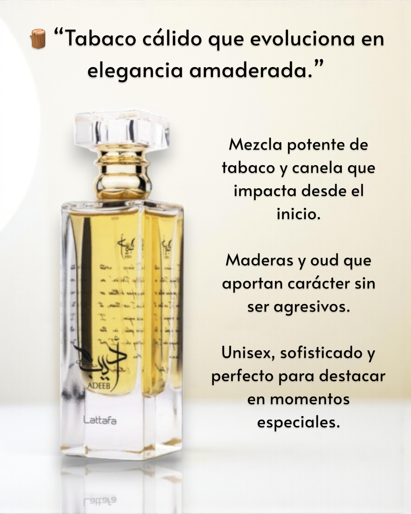 Adeeb de Lattafa es una fragancia envolvente y sofisticada con una combinación equilibrada de dulzura, especias y notas amaderadas. Desde la primera aplicación, se percibe un acorde cálido y especiado con un toque ahumado que añade misterio. Su corazón es una mezcla adictiva de maderas ricas y notas dulces, creando una sensación envolvente y elegante. En el fondo, el ámbar y la vainilla aportan profundidad y un efecto seductor de larga duración.