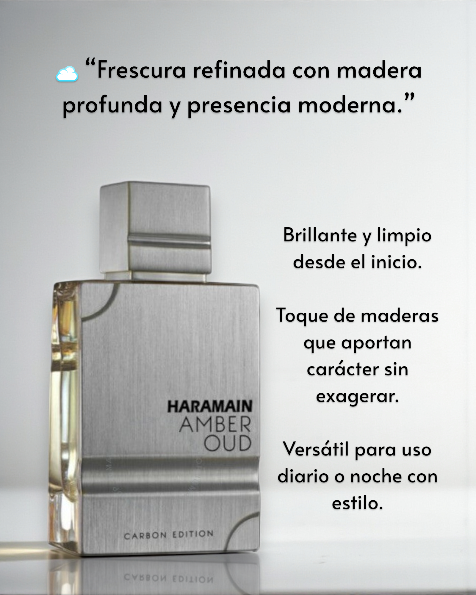 Amber Oud Carbon Edition de Al Haramain es una fragancia amaderada aromática que combina notas frescas y herbales para una experiencia olfativa sofisticada y energizante. Se abre con notas de bergamota, lavanda y romero, ofreciendo una introducción fresca y aromática. En el corazón, las notas marinas, el geranio y la salvia aportan una sensación de frescura y vitalidad. La base combina ámbar, musgo, vetiver y cedro, proporcionando una estela cálida y terrosa.