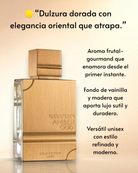 Amber Oud Gold Edition de Al Haramain es una fragancia oriental vainilla que combina notas dulces y afrutadas para una experiencia olfativa lujosa y envolvente. Se abre con notas de bergamota y acordes verdes, ofreciendo una introducción fresca y vibrante. En el corazón, el melón, la piña, las notas dulces y el ámbar aportan una riqueza jugosa y cálida. La base combina almizcle, vainilla y notas amaderadas, proporcionando una estela suave y cremosa.