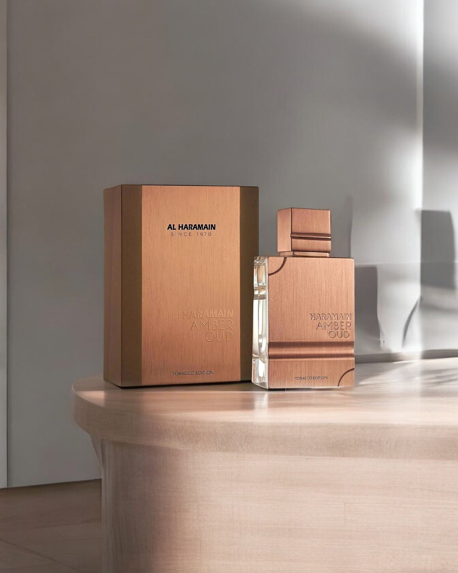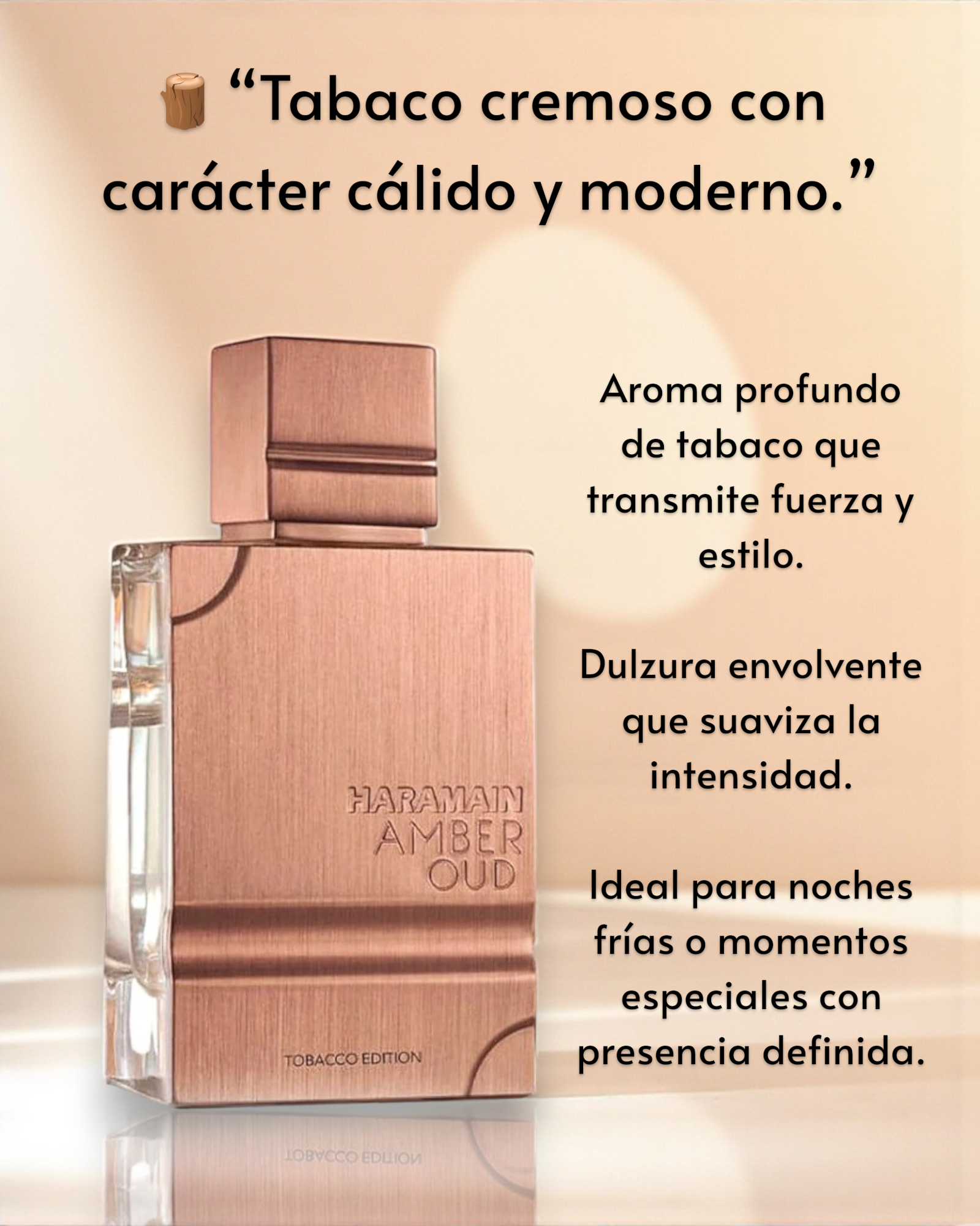 Amber Oud Tobacco Edition de Al Haramain es una fragancia oriental especiada que envuelve los sentidos con su calidez y profundidad. Se abre con notas de hojas de tabaco, canela, jengibre y pimienta negra, ofreciendo una introducción especiada y picante. En el corazón, la vainilla, clavo de olor, anís estrellado, haba tonka, cacao e incienso aportan una riqueza dulce y resinosa. La base combina tabaco, frutos secos y notas amaderadas, proporcionando una estela duradera y envolvente.