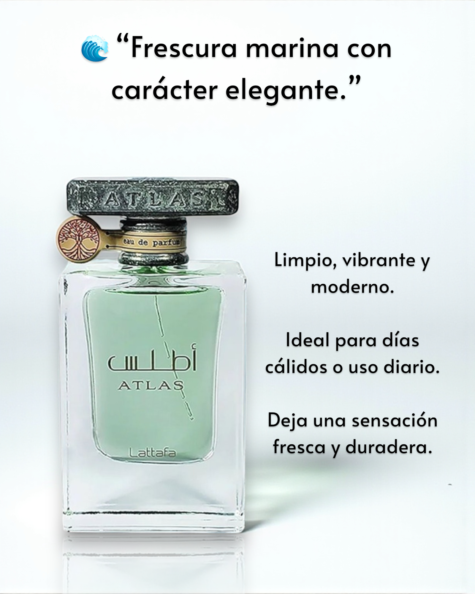 Atlas de Lattafa es una fragancia acuática y amaderada que se abre con notas marinas, sal y limón, brindando una sensación fresca y revitalizante. El corazón presenta davana e iris, aportando una faceta aromática y floral. En el fondo, el ámbar gris, el musgo de roble y el sándalo crean una base cálida y terrosa, equilibrando la frescura inicial con una profundidad sofisticada.